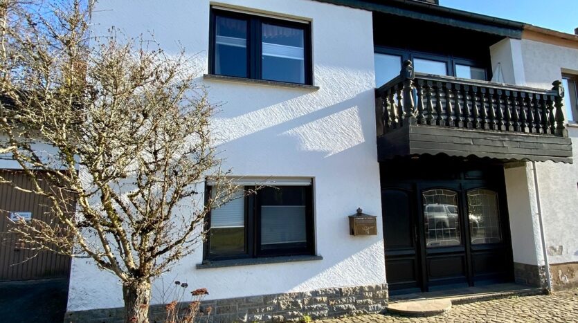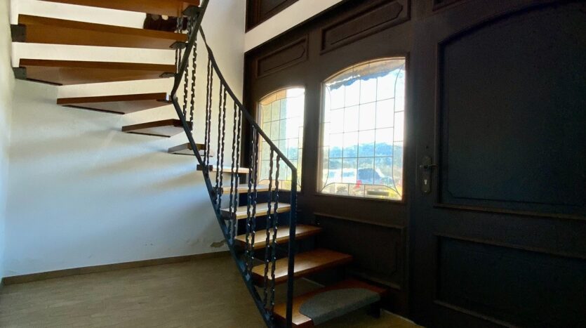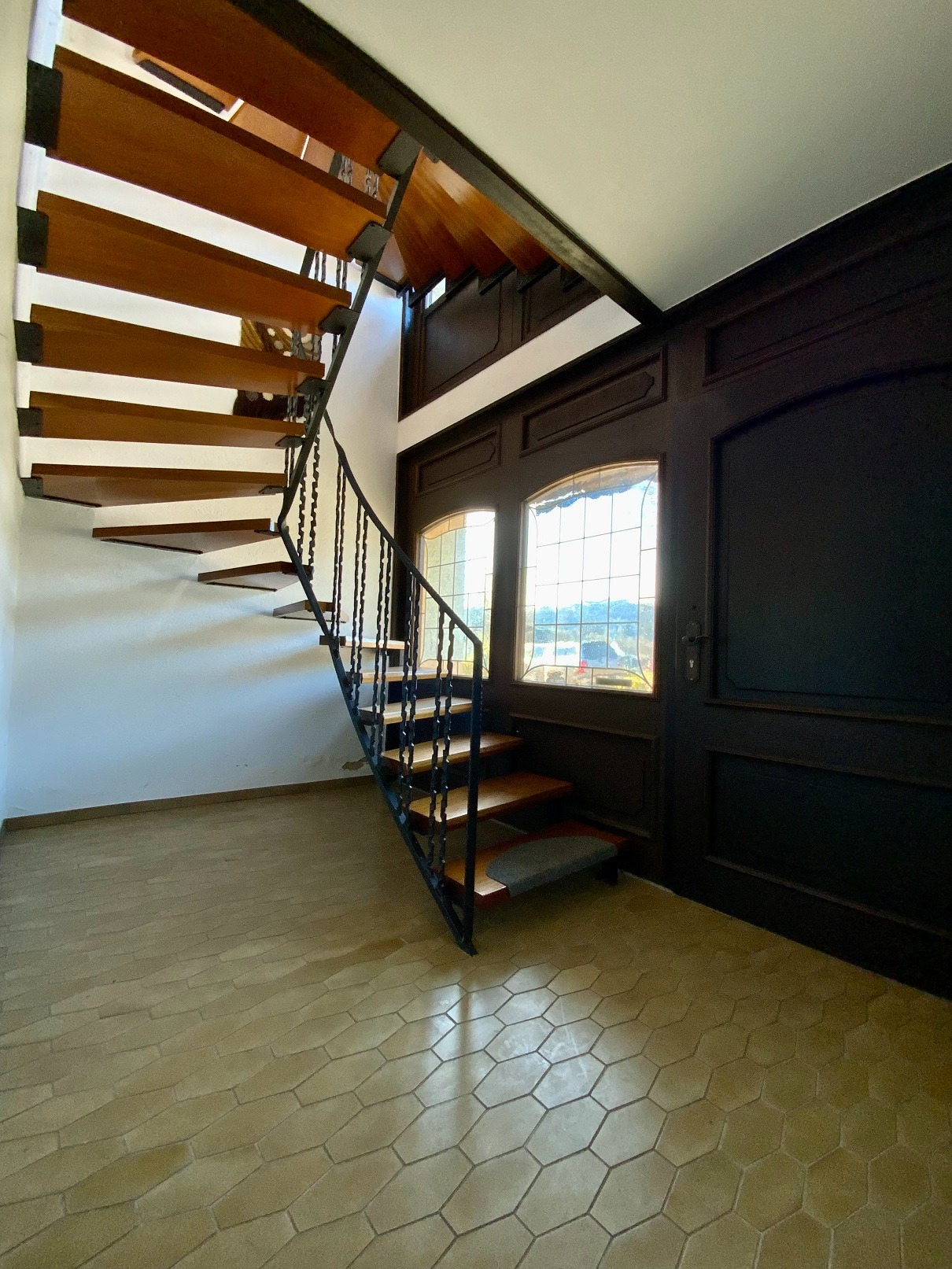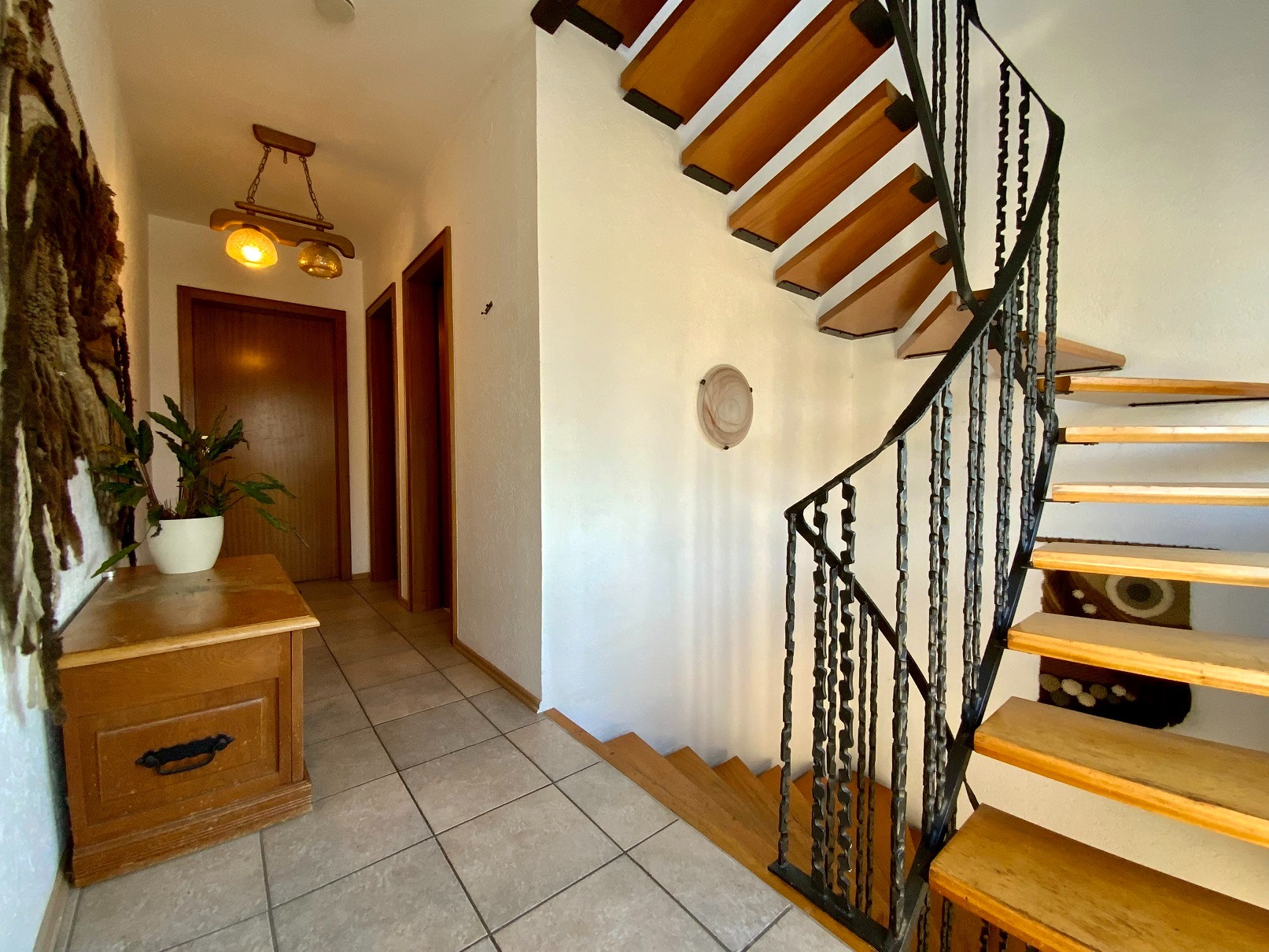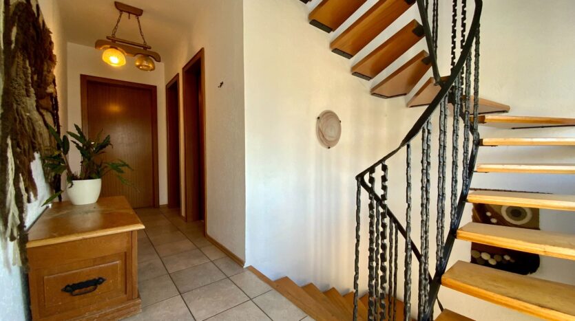 Eine massive Treppe führt zum Obergeschoss. Das Obergeschoss teilt sich auf in den gefliesten Flur, Gästetoilette, Abstellraum, eine Küche incl. Einbauküche, ein großes Wohnzimmer mit Balkon und Zugang zur befestigten Terrasse.