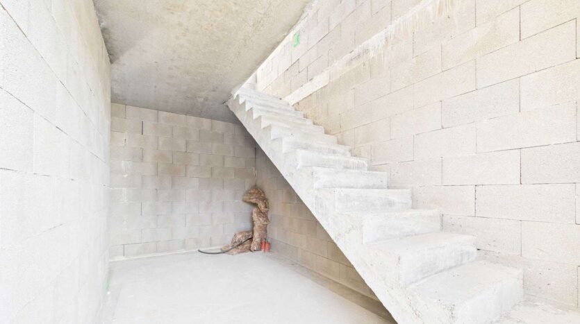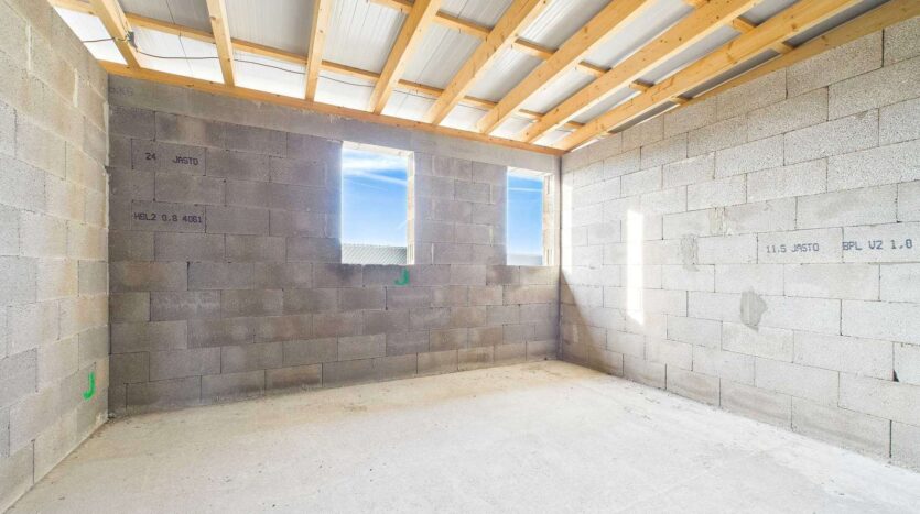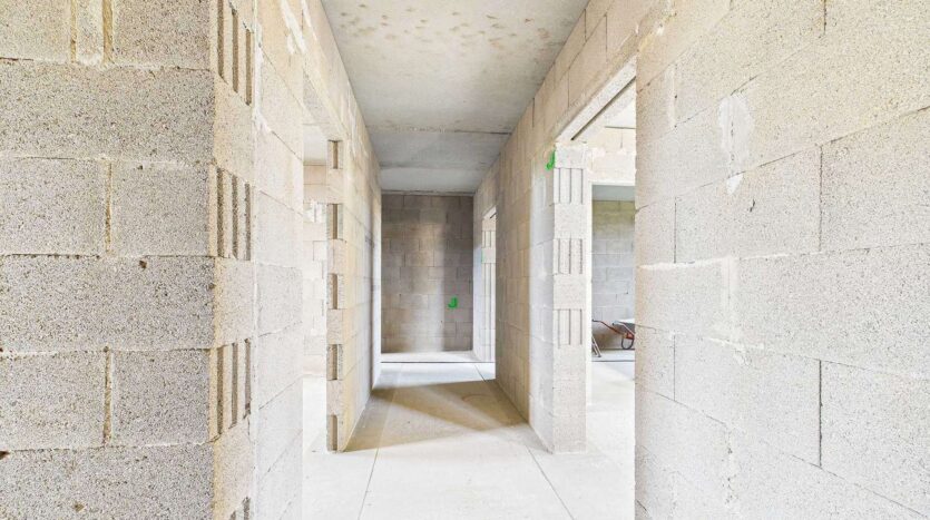 Das Bürogebäude ist ein Rohbau mit Dach. Fenster und sämtliche Installationen sind noch nicht vorhanden.