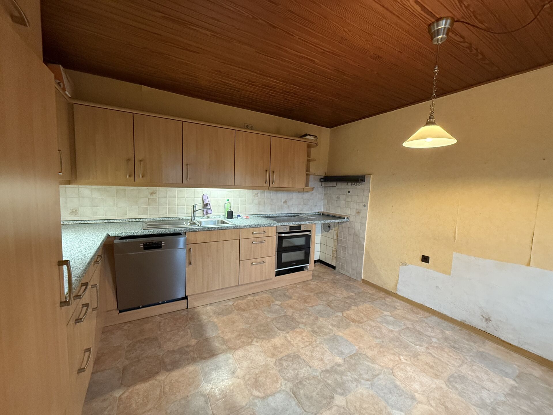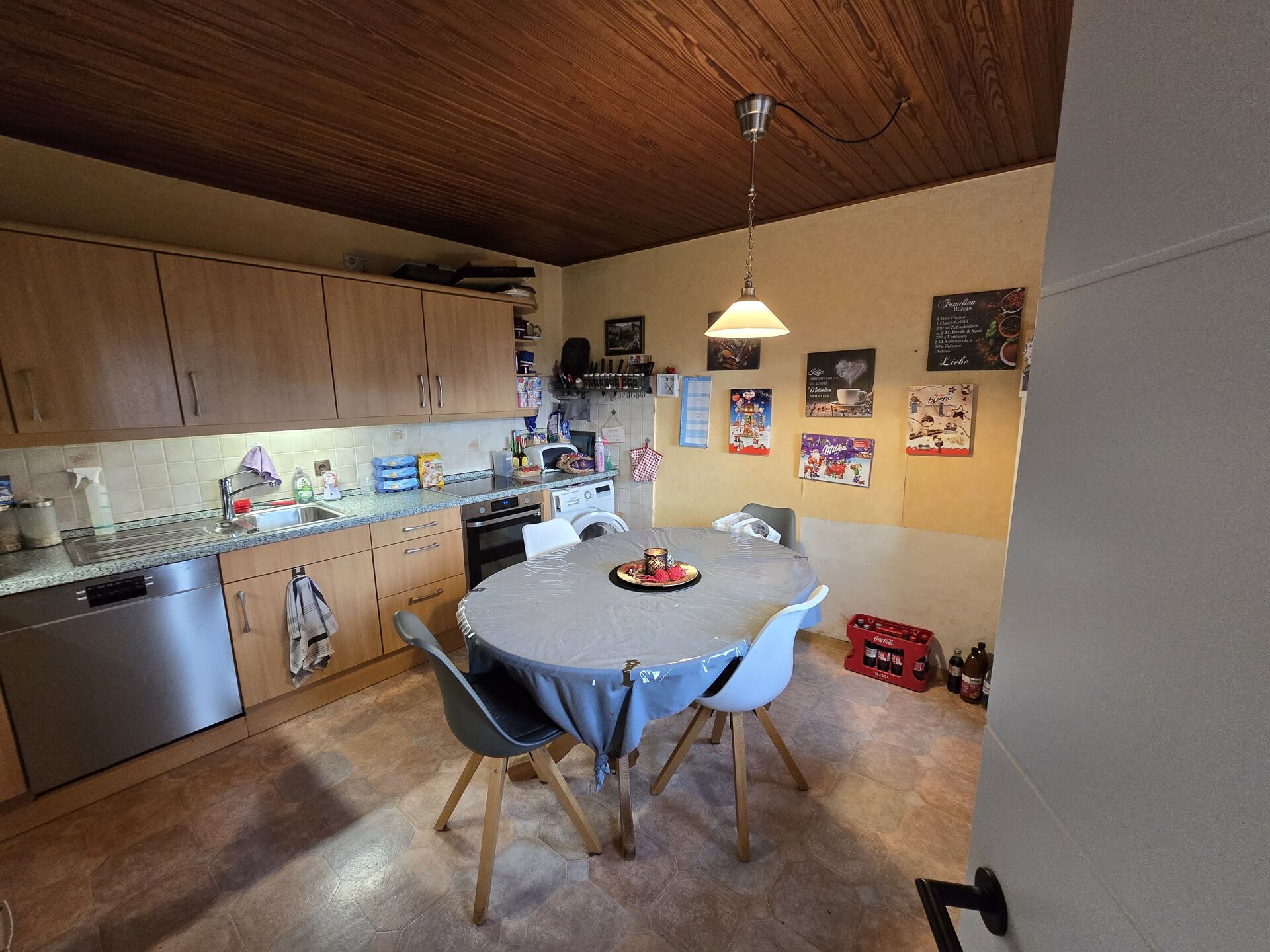 Bereits beim Betreten des Hauses überzeugt das Erdgeschoss mit einem großzügigen Wohnzimmer, das durch einen modernen Pelletofen mit automatischer Steuerung beheizt wird. Dieser sorgt nicht nur für eine behagliche Atmosphäre, sondern ist zugleich umweltfreundlich und kosteneffizient. Die gepflegte Küche befindet sich ebenfalls im Erdgeschoss.