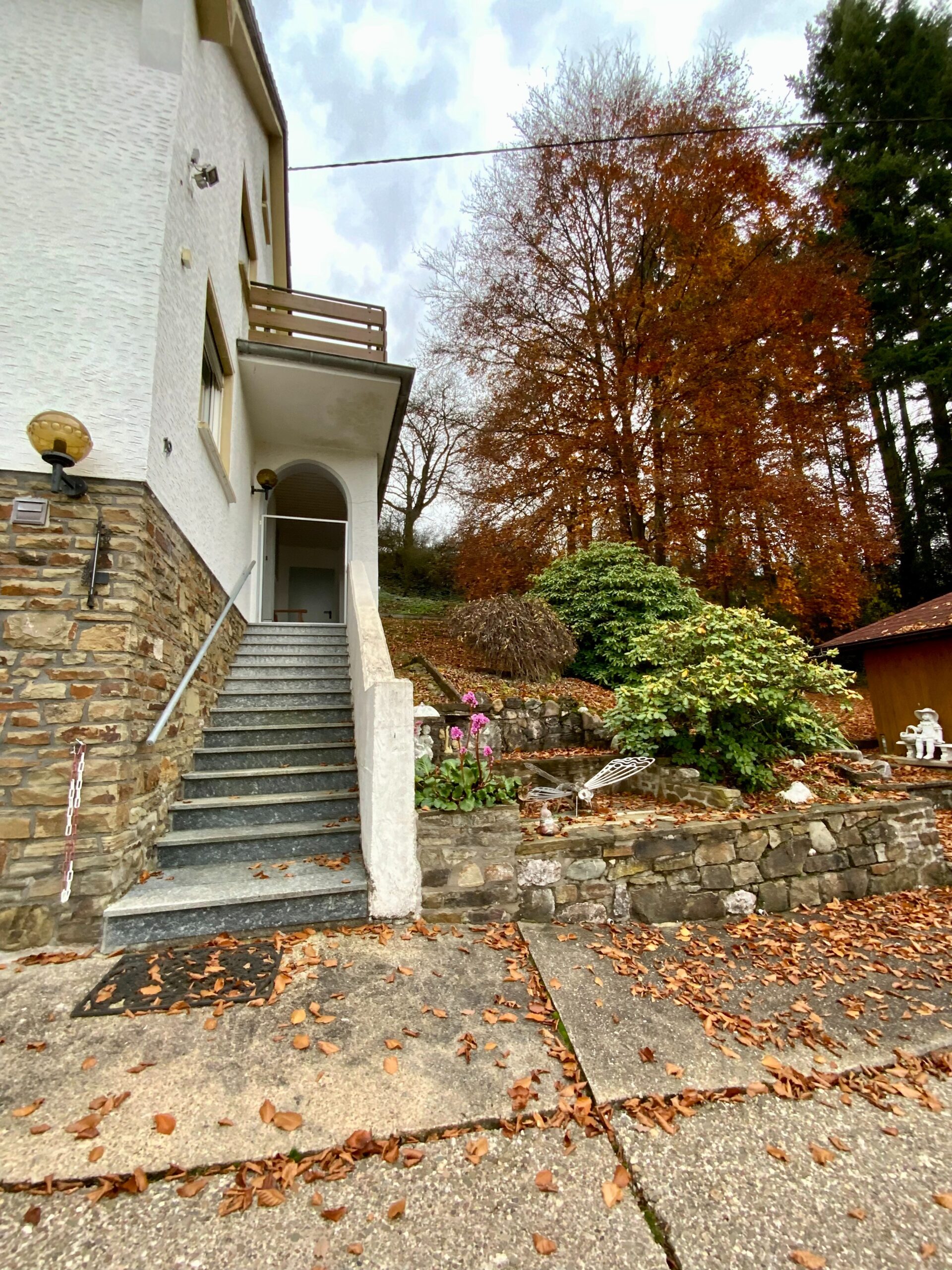 Der Haupteingangsbereich befindet sich an der Vorderseite des Hauses und ist über einige Treppenstufen zu erreichen.