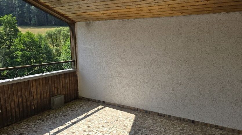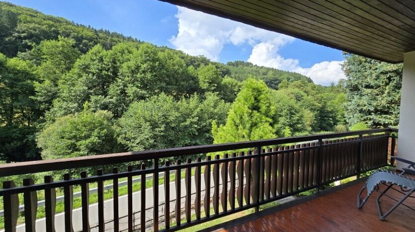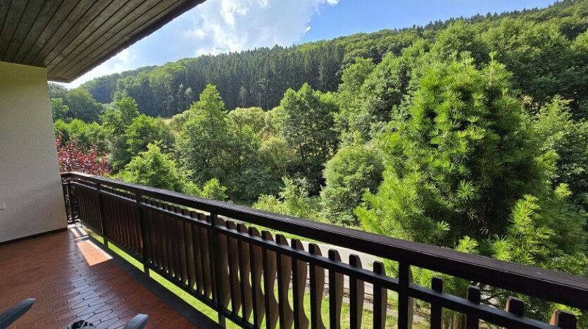 Vom Wohnzimmer aus gelangt man auch auf den großzügigen und überdachten Balkon mit herrlichem Ausblick.