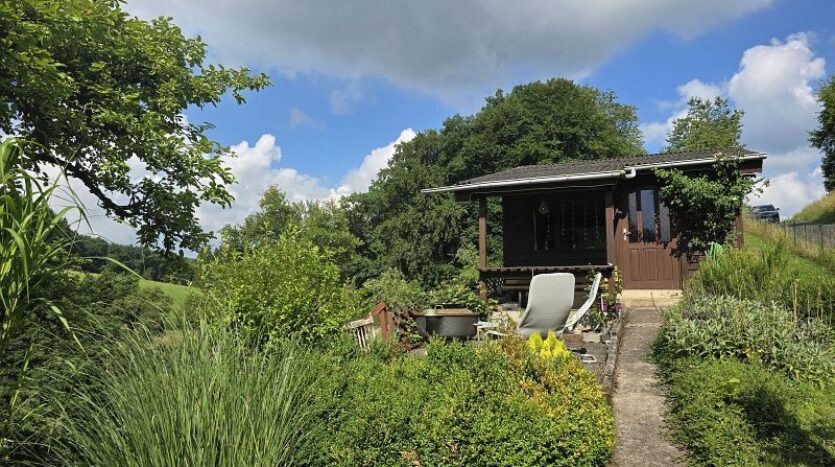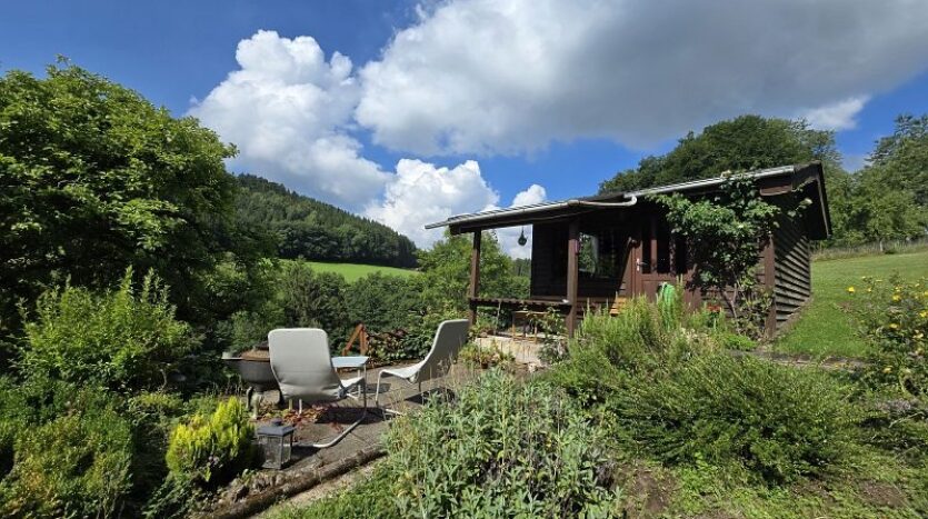 Oberhalb des Hauses wurde ein kleines Gartenparadies mit Gartenhaus angelegt. Von hier aus genießt man einen wunderschönen Ausblick in die Natur.