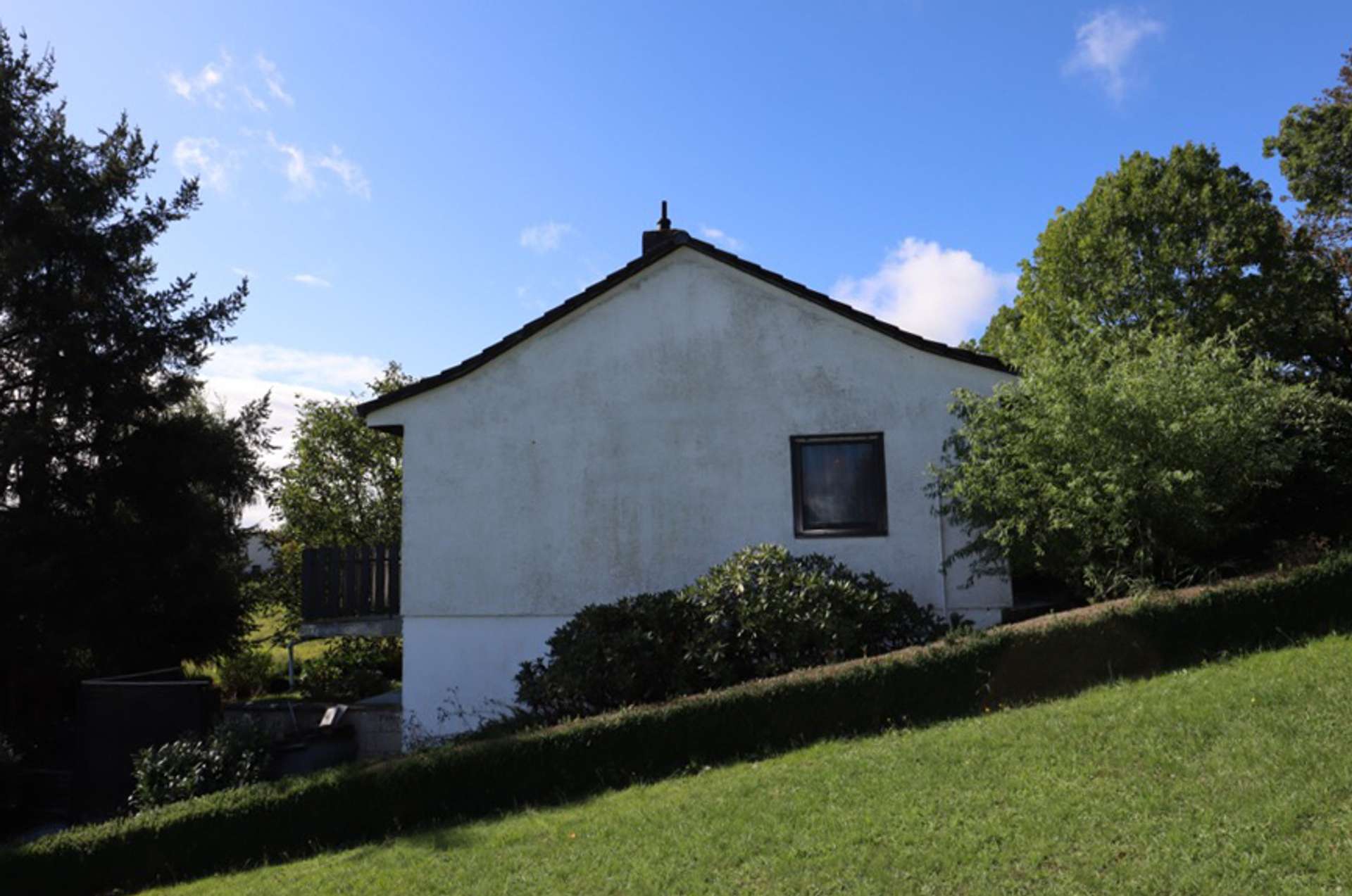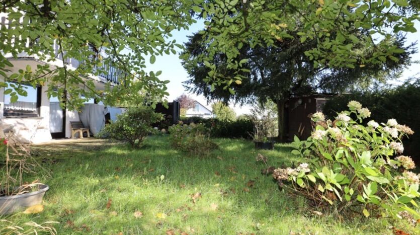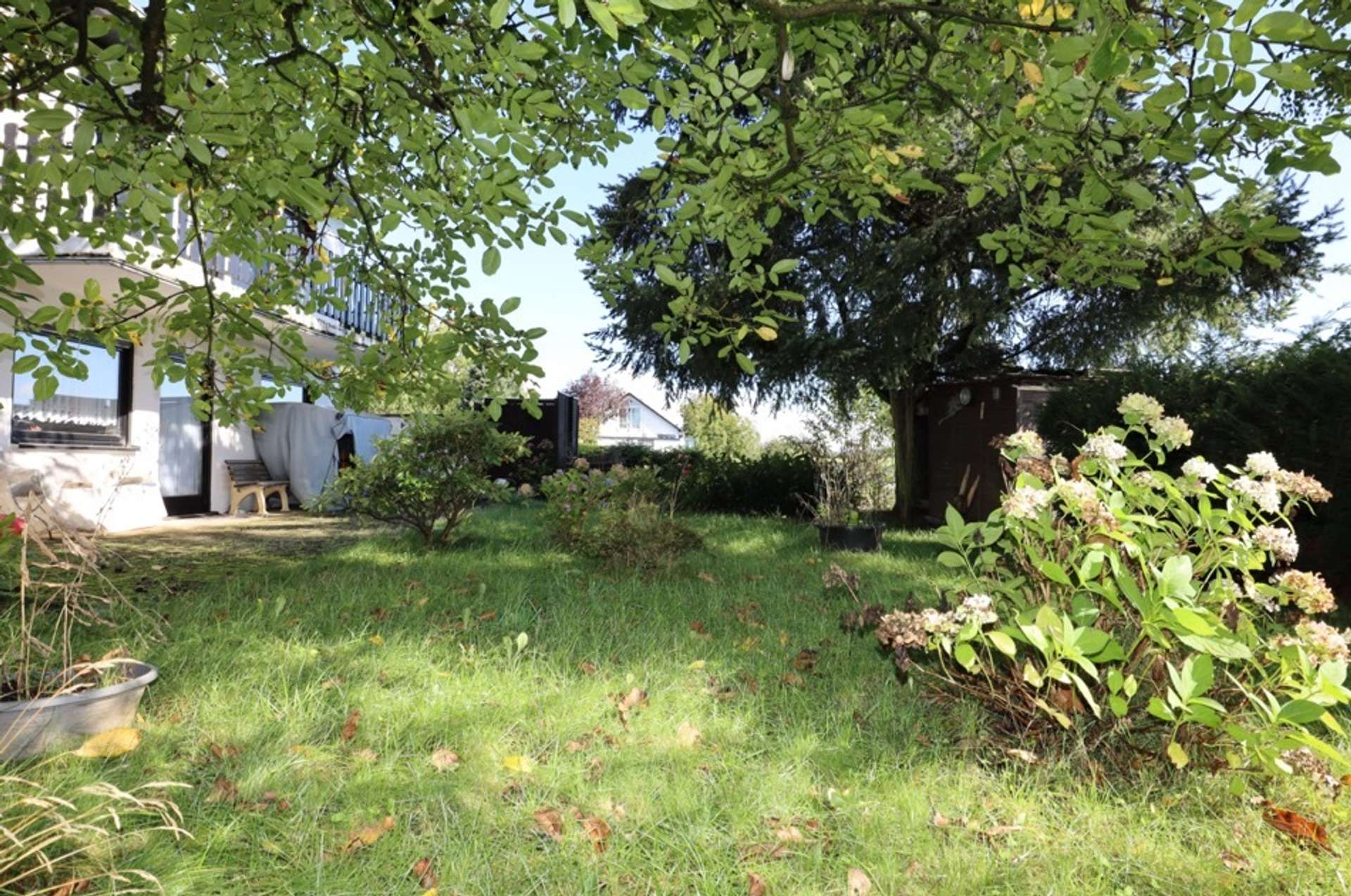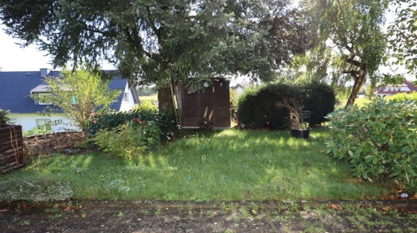 Das Grundstück ist 946 m² groß. Vor dem Haus befindet sich ein schöner Vorgarten. Rechts an das Haus angebaut, befindet sich eine Garage für einen Pkw. Direkt unter der Garage auf Niveau des Untergeschosses, befindet sich ein Geräteraum, der von außen zugänglich ist. Alter Baumbestand beschattet das Haus. Der Garten ist aktuell pflegeleicht angelegt und wartet auf Gartenliebhaber mit grünem Daumen.