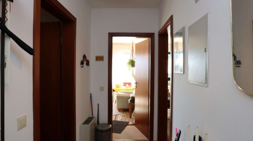 Erdgeschoss: Eingang, Diele, Bad mit Badewanne und WC, Schlafzimmer, Wohnzimmer mit Balkonzugang, Küche