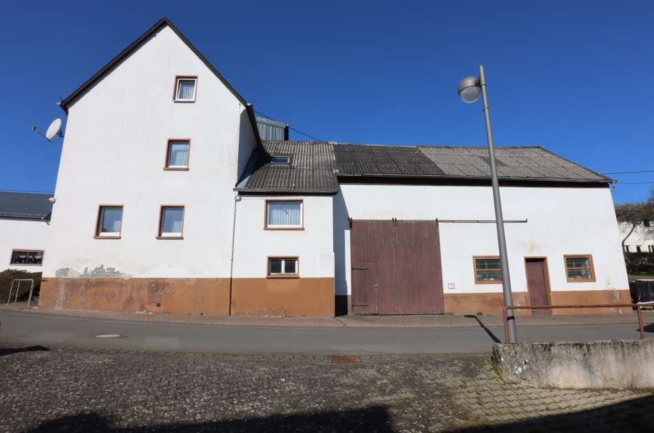 Außen: gepflasterter Bereich vor dem Haus, Scheune, Werkstatt, Garten.