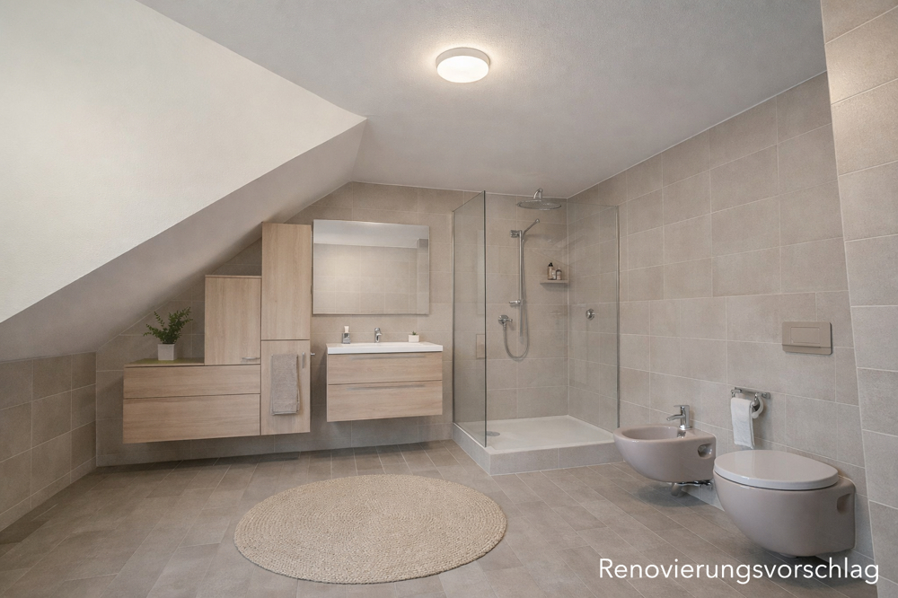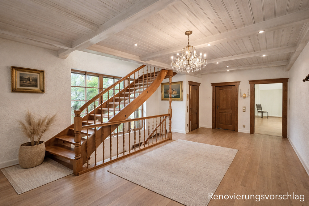 Über eine stilvolle Holztreppe gelangen Sie ins Obergeschoss. Diese Etage kann bei Bedarf als eigenständige Wohneinheit genutzt werden. Insgesamt stehen hier sechs Zimmer unterschiedlicher Größe zur Verfügung, ergänzt durch ein Tageslichtbad und ein Gäste-WC.