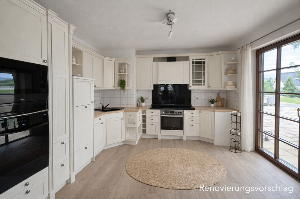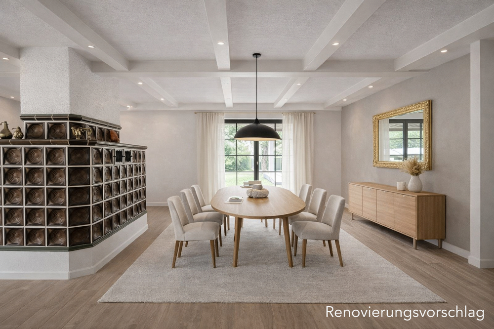 Das Herzstück der Immobilie bildet der ca. 68 m² große Wohn- und Essbereich mit Kamin und direktem Zugang zur Außenterrasse. Die angrenzende Küche ist mit einer neuwertigen Einbauküche ausgestattet. Ein weiterer Raum mit integrierter Küche wurde bisher als Grill- und Outdoorküche genutzt und erweitert die Möglichkeiten für gesellige Stunden.