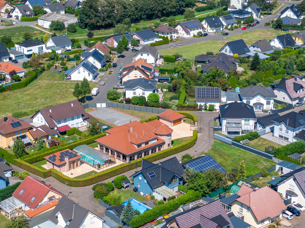 Der Gebäudekomplex besteht aus dem großzügigen Wohnhaus über zwei Etagen sowie zwei Doppelgaragen und dem massiv errichteten Poolhaus.