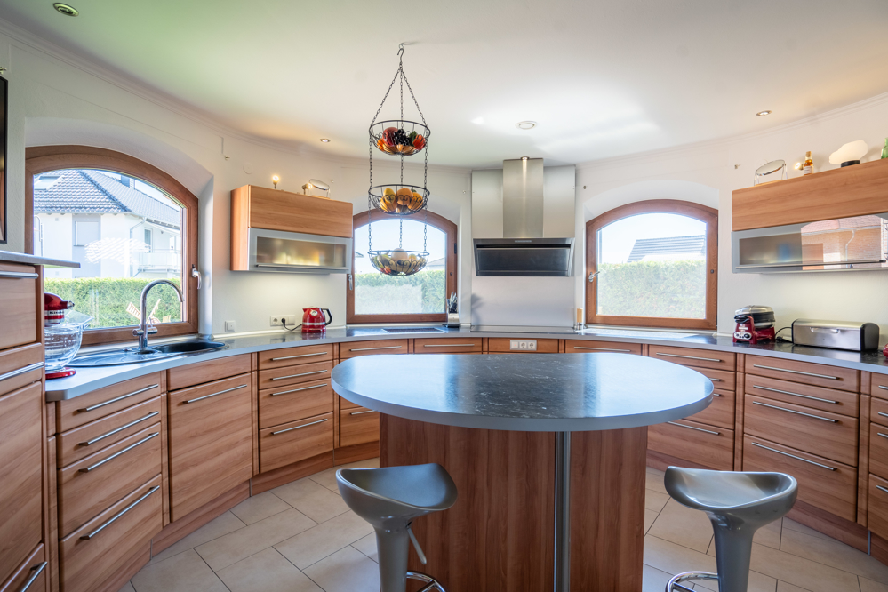maßgefertigte, hochwertige Markeneinbauküche im Erdgeschoss des „Turmes“ und genießen einen nahezu „Rundumblick“, während Sie hier Kochabende mit Ihrer Familie und Freunden verbringen. Für den Aperitif schließt sich hier im Durchgang zum Esszimmer eine kleine Getränkeküche mit Weinklimaschrank und Kaffeeautomat an.