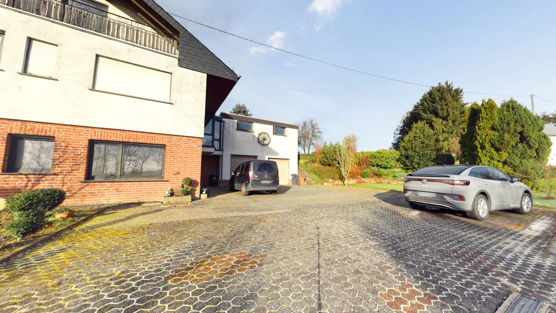 großzügige, befestigte Hoffläche; zwei PKW-Garagen und ein Geräteschuppen