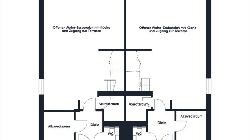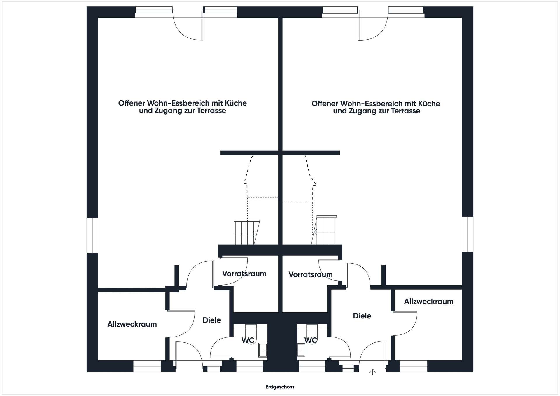 Der großzügige Wohn- und Essbereich mit offener Küche bildet das Herzstück des Hauses – lichtdurchflutet, offen gestaltet und mit direktem Zugang zur Terrasse und in den Garten. Hier entstehen Orte des Zusammenkommens und Wohlfühlmomente für jede Lebenssituation. Ergänzt wird das Erdgeschoss durch ein Gäste-WC, einen praktischen Hauswirtschaftsraum sowie einen Abstellraum mit viel Stauraum.