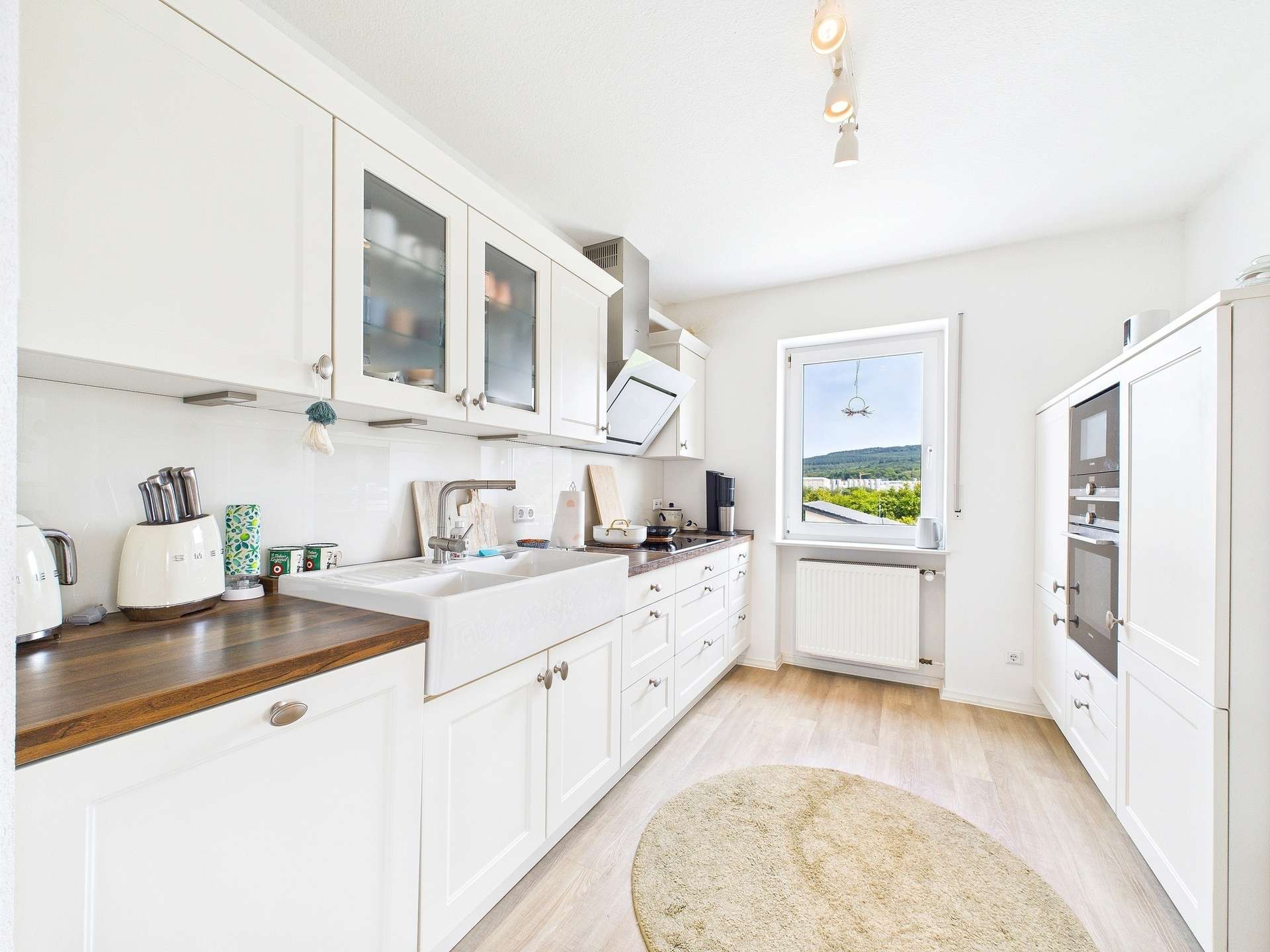 Der lichtdurchflutete Wohn- und Essbereich mit Balkon bietet ein angenehmes Wohngefühl. Die moderne, im Kaufpreis enthaltene Einbauküche ist hochwertig ausgestattet und steigert die Vermietbarkeit. Zwei weitere Zimmer, ein Tageslichtbad mit Wanne und Dusche sowie ein separates Gäste-WC runden die Hauptebene ab.