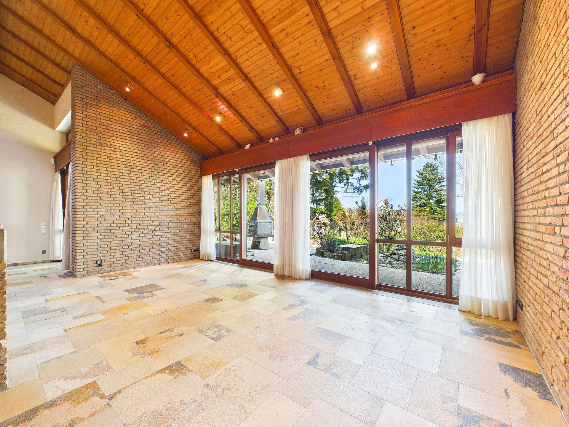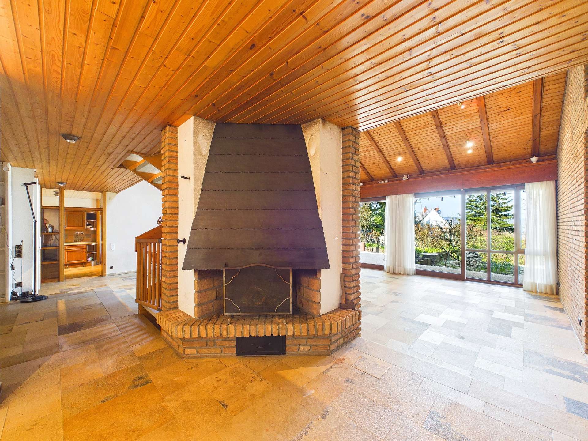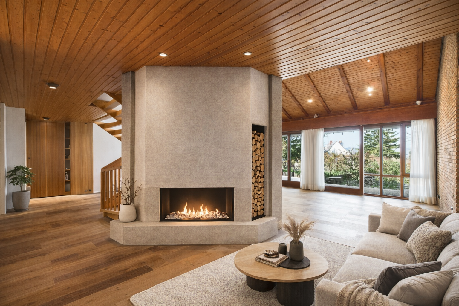 + Lichtdurchfluteter Wohnbereich mit stilvollem Holzkamin