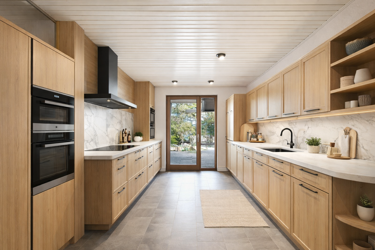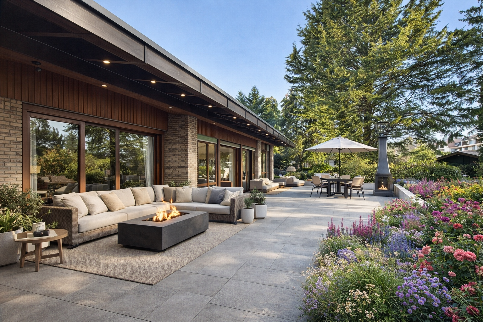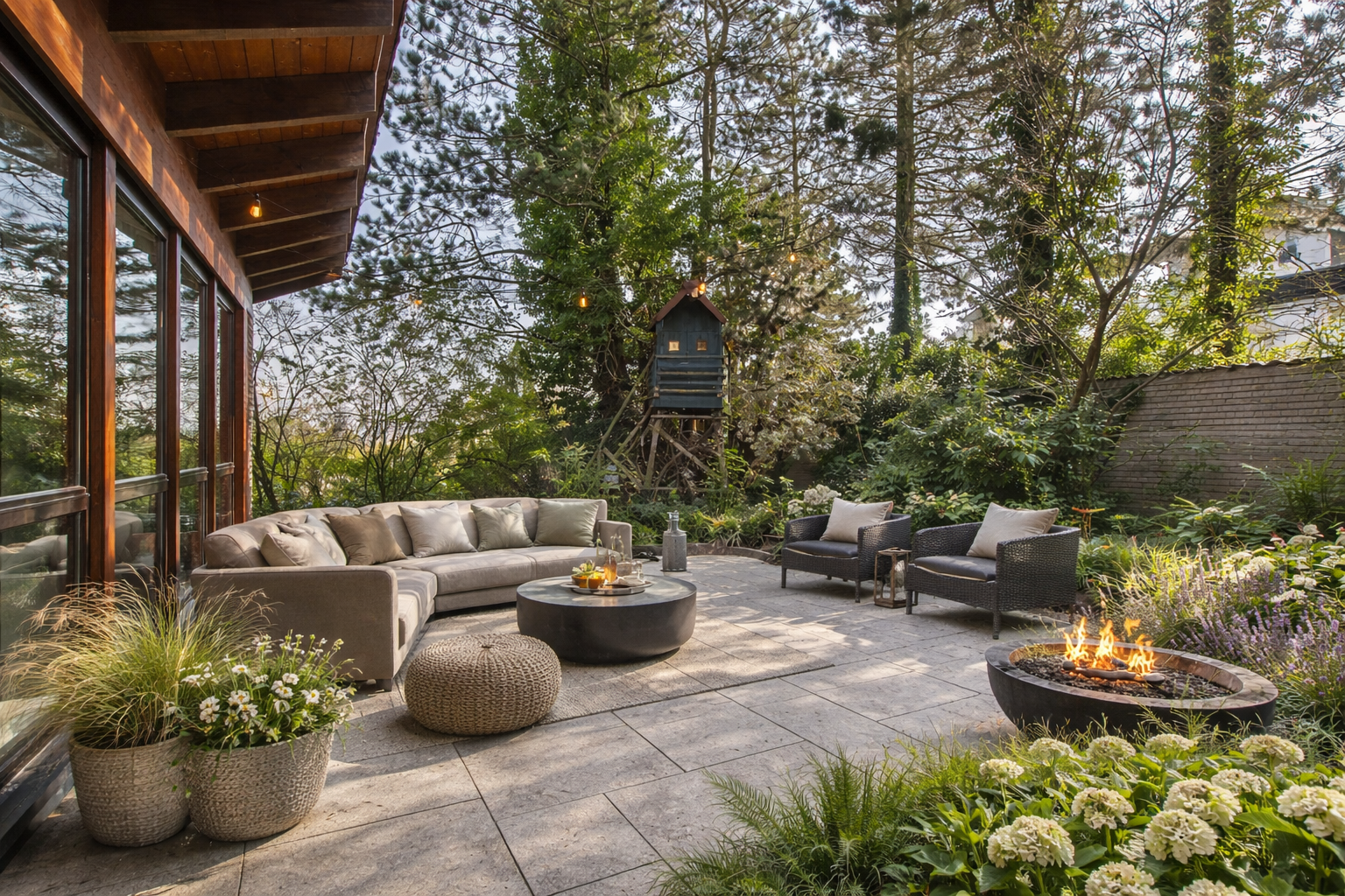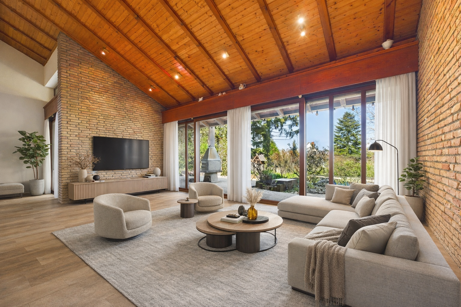 + Lichtdurchfluteter Wohnbereich mit stilvollem Holzkamin