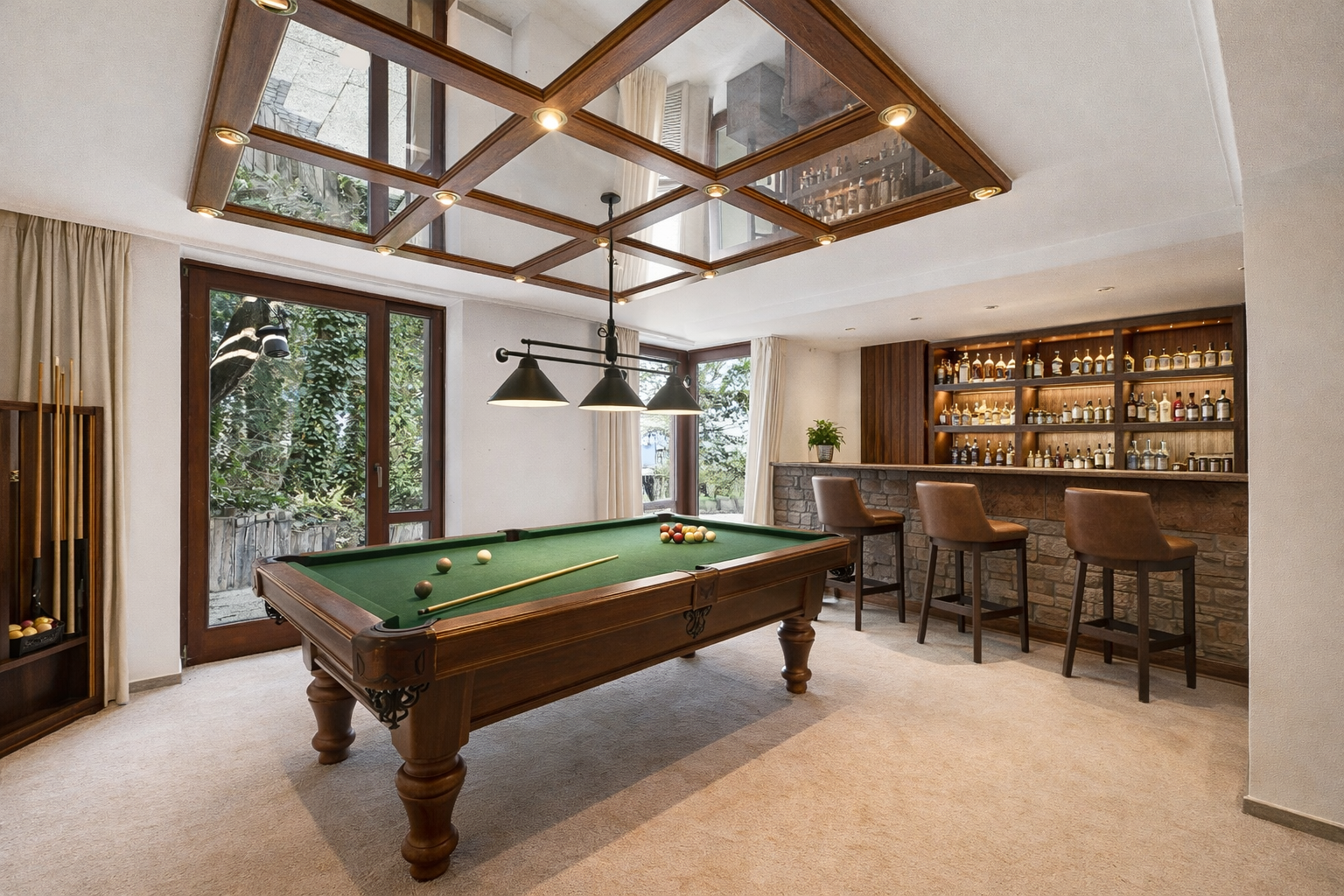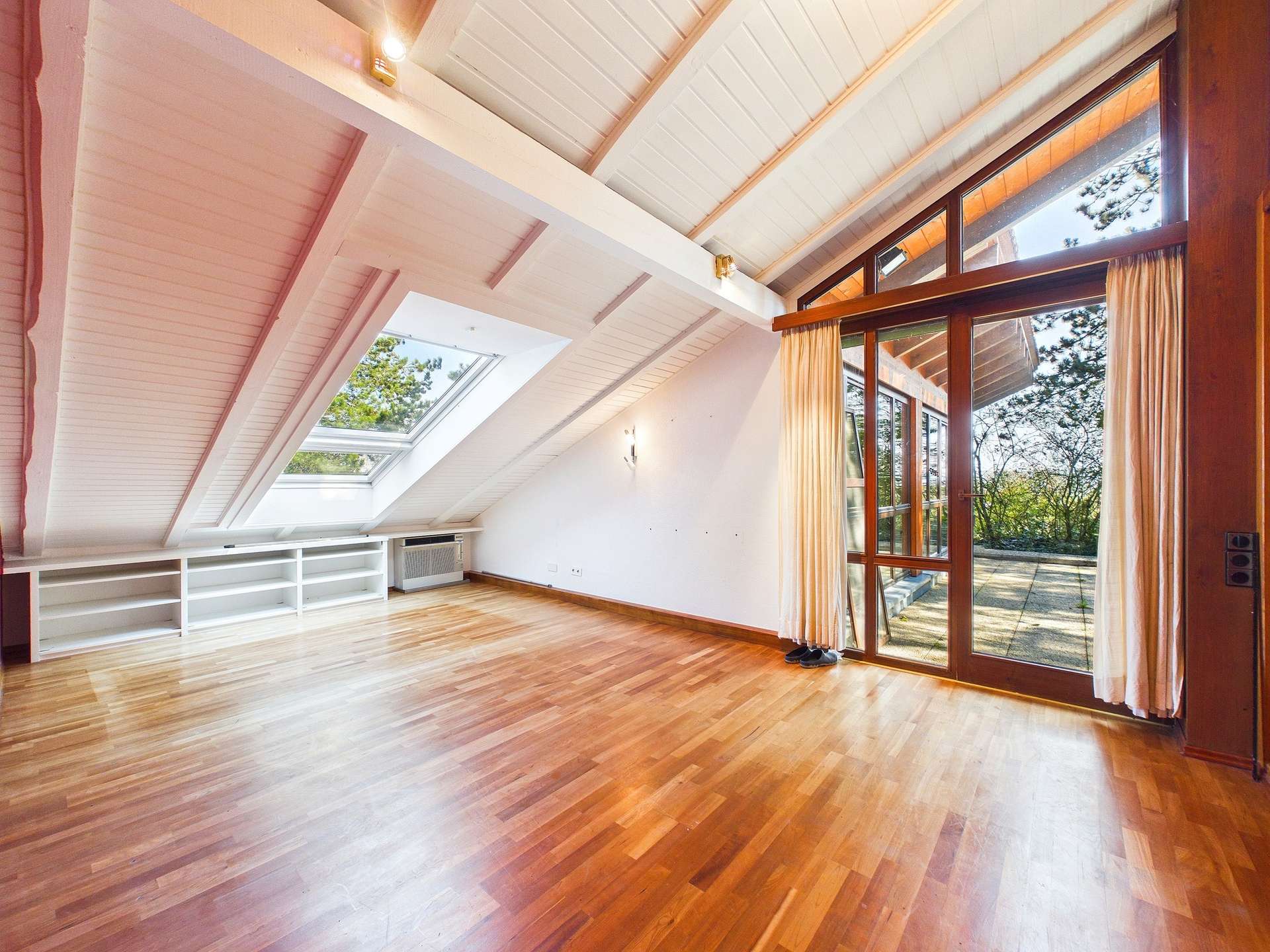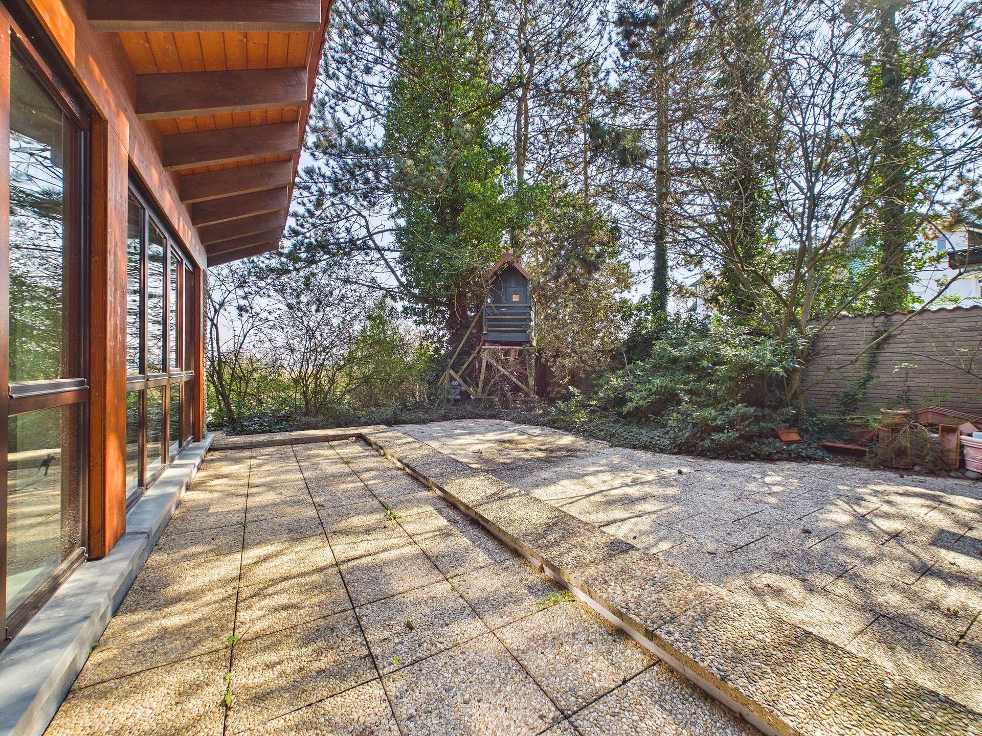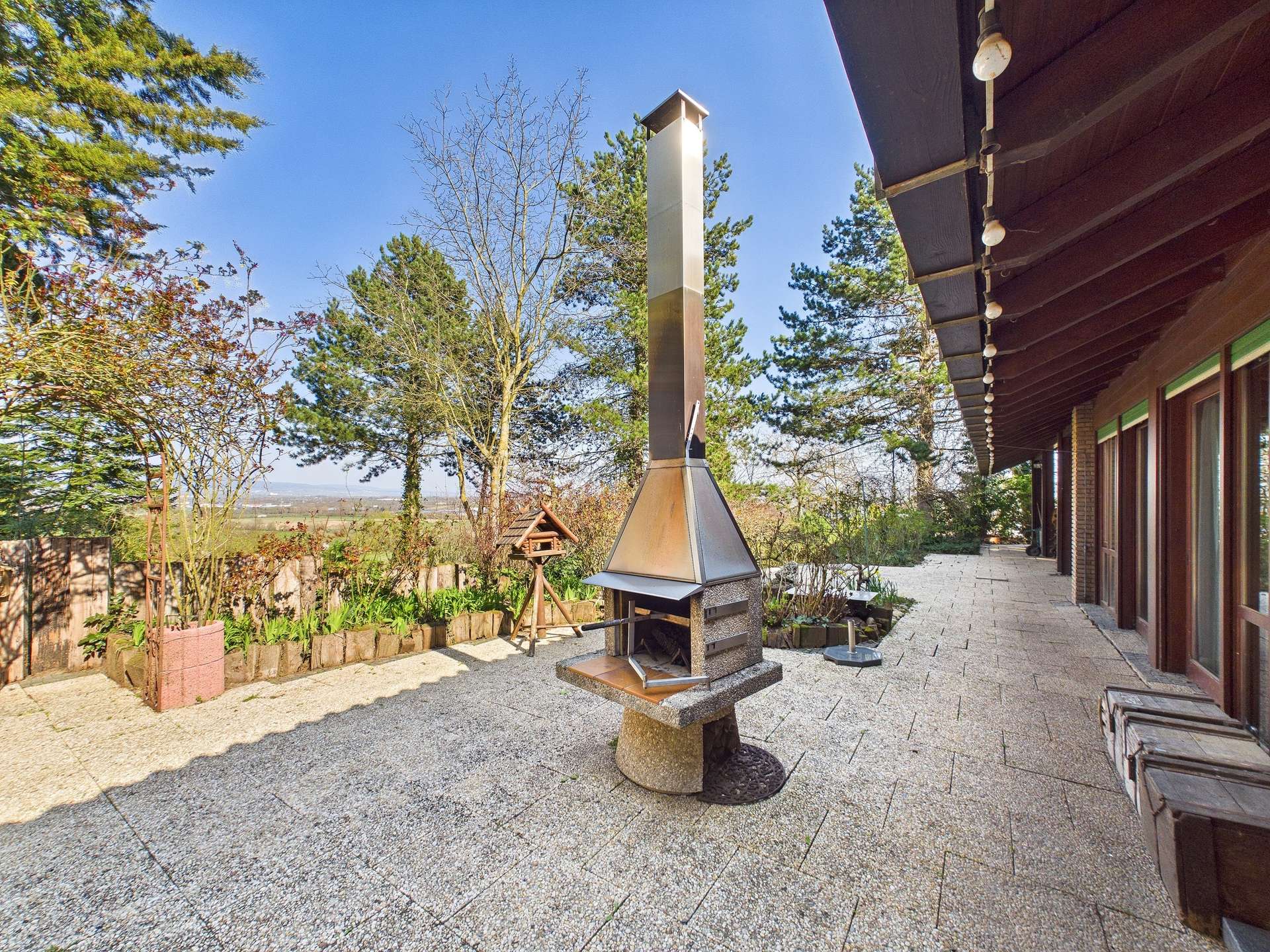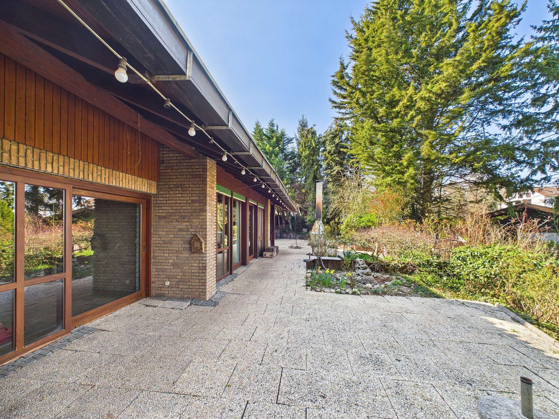 Besonders eindrucksvoll ist die Wirkung der großzügigen Fensterfronten, die dem Haus seine unverwechselbare Offenheit und Leichtigkeit verleihen. Sie holen den Garten und die besondere Aussicht förmlich ins Haus und unterstreichen den architektonischen Anspruch dieser Immobilie. Die Terrassenbereiche sind dabei weit mehr als nur Außenflächen, sie sind Rückzugsorte, Aussichtspunkte und Erweiterung des Wohnraums zugleich. Der Blick ins Grüne vermittelt Ruhe, Freiheit und ein Wohngefühl, das nur selten in dieser Form zu finden ist.