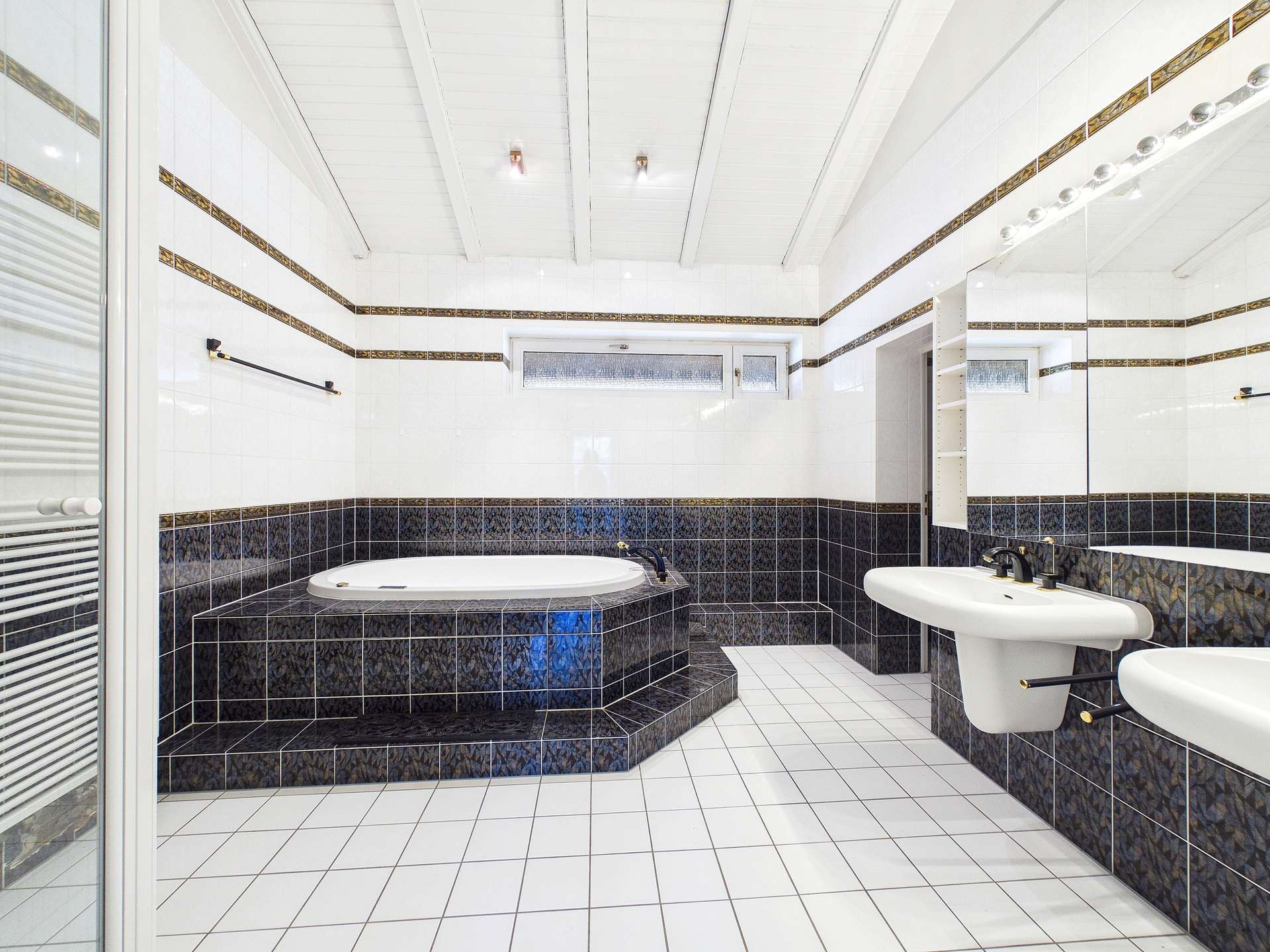 Die Bodenbeläge unterstreichen den hochwertigen Charakter der Immobilie und bestehen aus Solnhofener Platten, Fliesen sowie Echtholzboden.