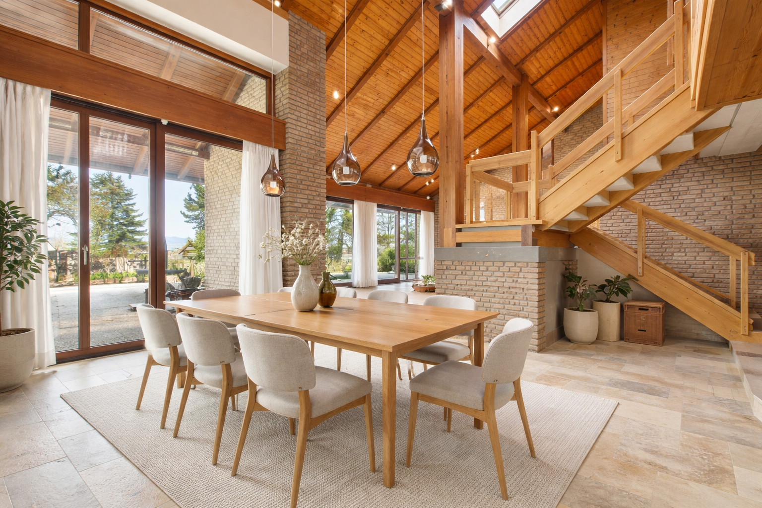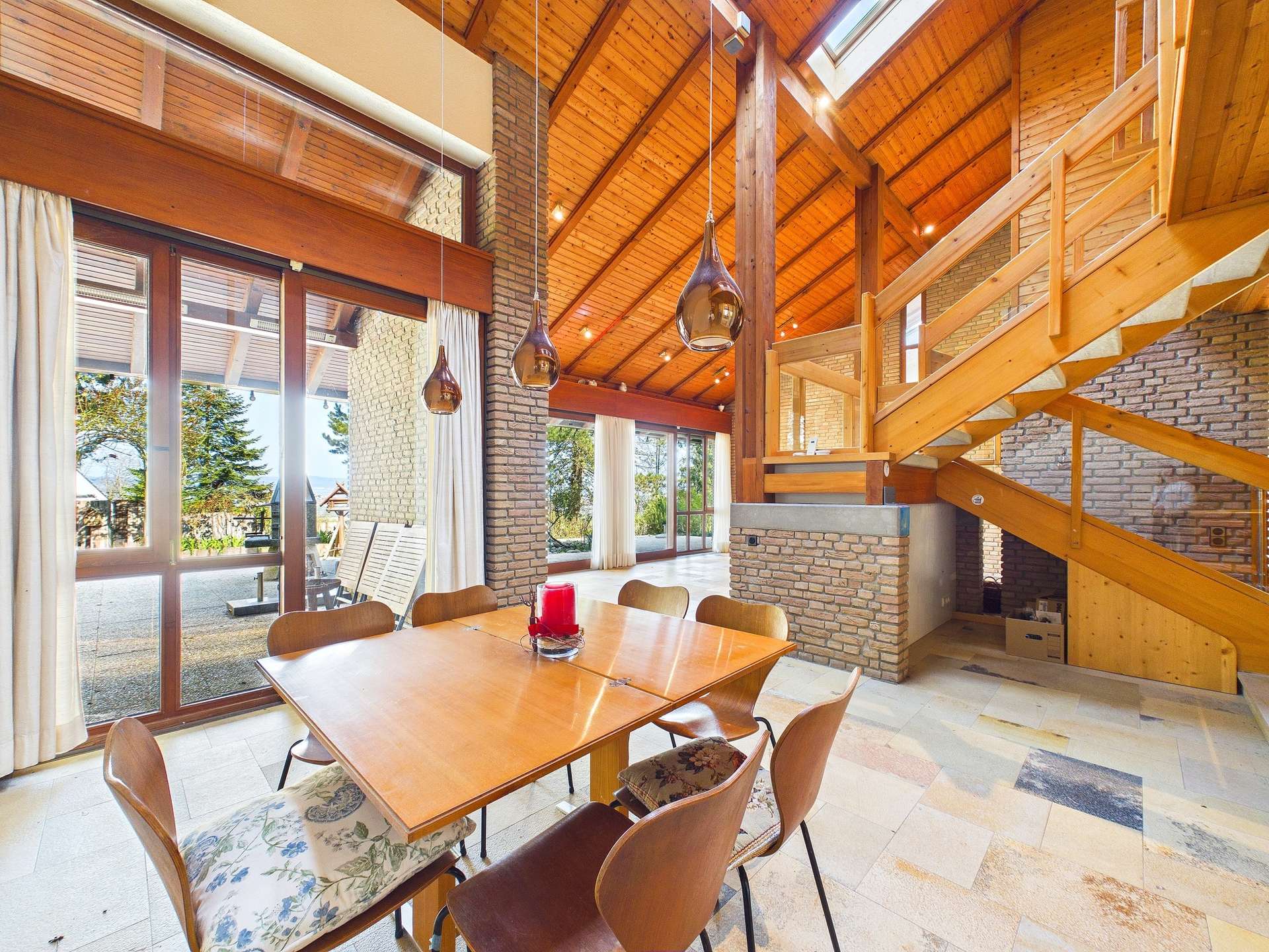Die Empore führt den Blick weiter nach unten in den eigentlichen Mittelpunkt des Hauses: den großzügigen, lichtdurchfluteten Wohn- und Essbereich. Dieser Raum ist mehr als nur ein Aufenthaltsort, er ist das Herzstück des Hauses. Großzügige Fensterflächen lassen viel Tageslicht herein und verbinden die Innenräume mit dem Außenbereich auf eindrucksvolle Weise. Der Holzkamin, der weiterhin betrieben werden darf, schafft Wärme, Atmosphäre und genau jene Wohnqualität, die man sich in einem Haus dieser Klasse wünscht. Hier entsteht jener Ort, an dem Familie, Freunde und Alltag auf schönste Weise zusammenfinden.