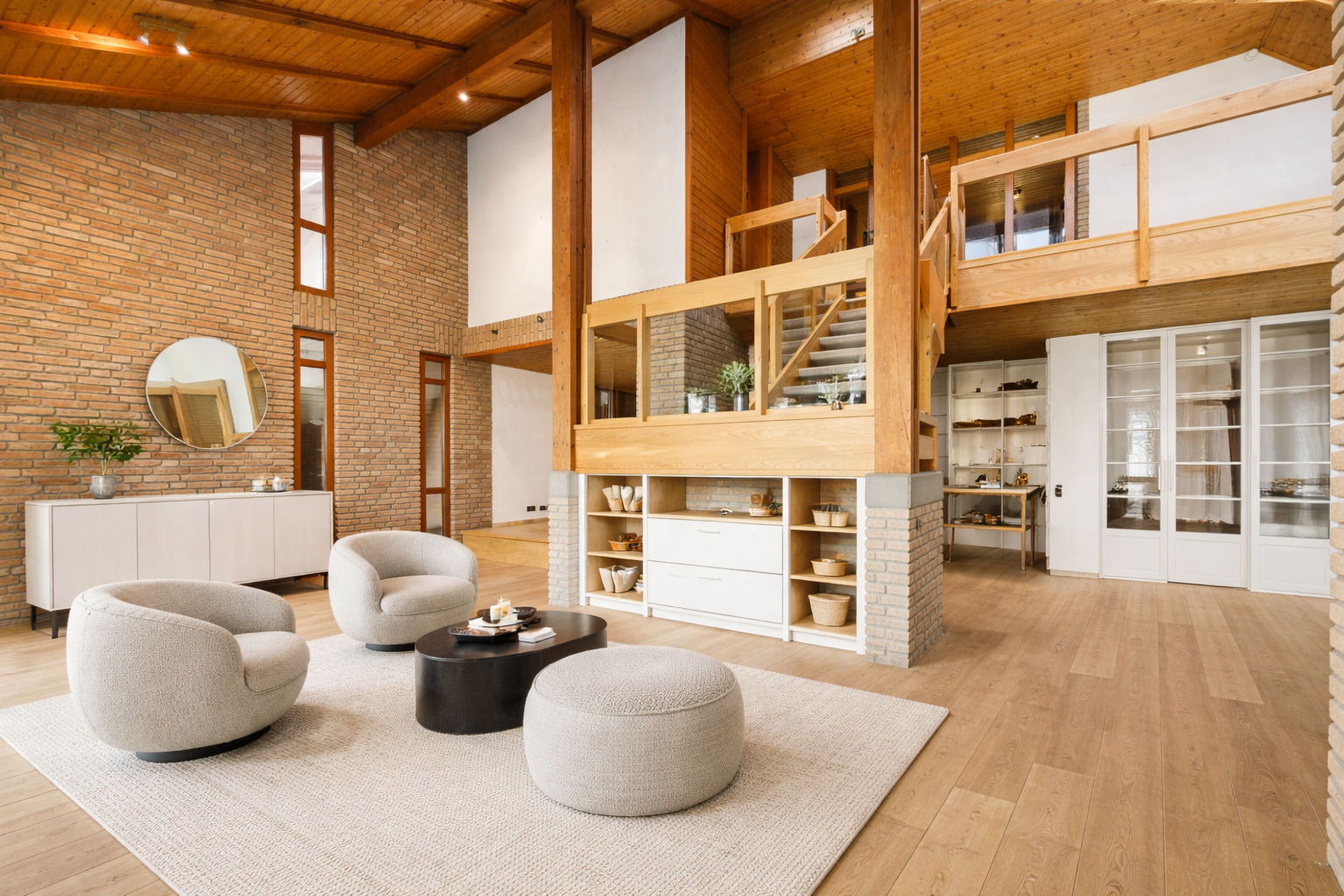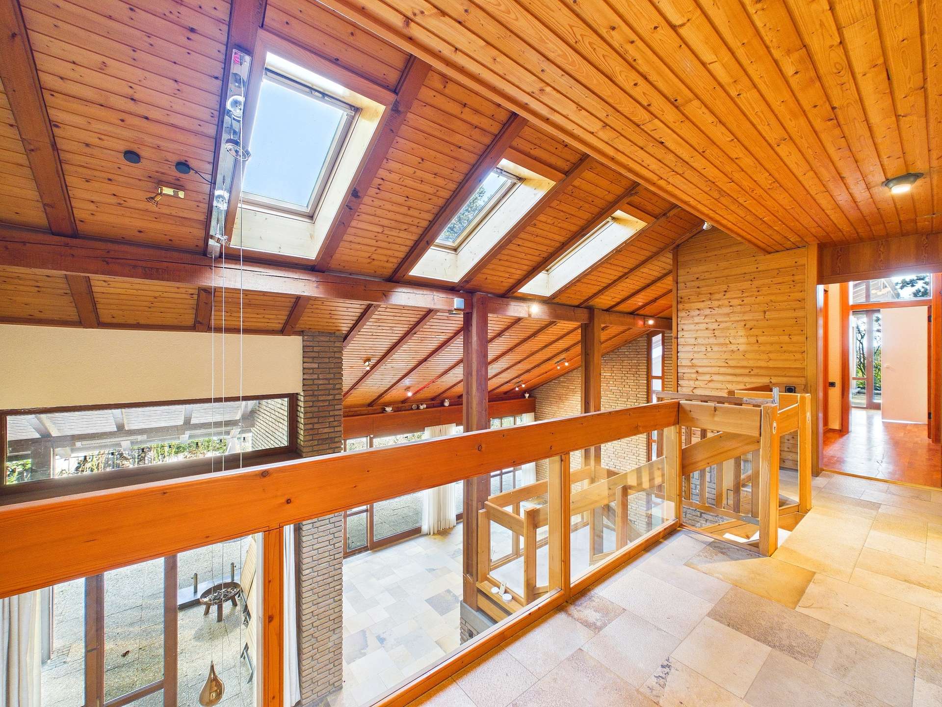 Geradeaus eröffnet sich der Blick auf die eindrucksvolle Empore, die dem Haus Weite, Licht und eine außergewöhnliche Raumwirkung verleiht. Hier zeigt sich bereits jene architektonische Handschrift, die diese Immobilie so besonders macht.