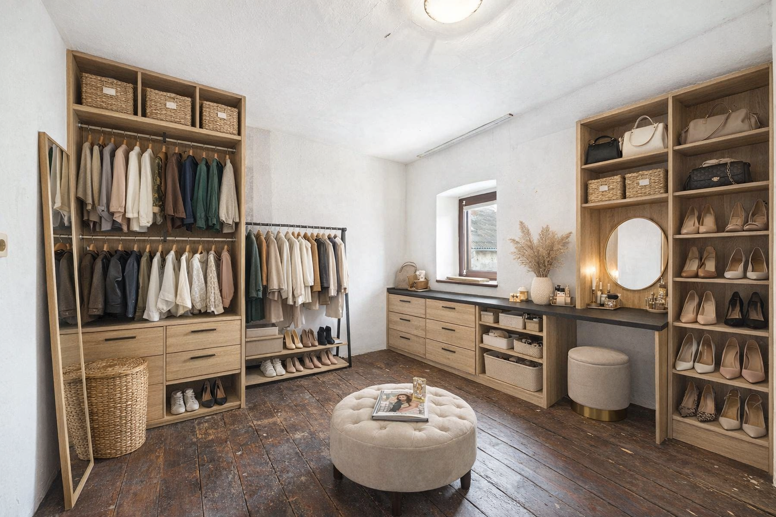 Im Obergeschoss stehen bis zu vier Zimmer zur Verfügung, die sich flexibel als Schlaf-, Kinder- oder Arbeitszimmer nutzen lassen. Eines der Zimmer ist als Durchgangszimmer gestaltet und eignet sich daher insbesondere als Ankleide in Verbindung mit einem der angrenzenden Schlafzimmer. Darüber hinaus befindet sich über dem Küchenbereich ein kleiner Raum, der sich perspektivisch für den Ausbau eines zusätzlichen Badezimmers anbietet. Über dem Wohnbereich liegt ein Speicher, der weiteren Stauraum bietet.