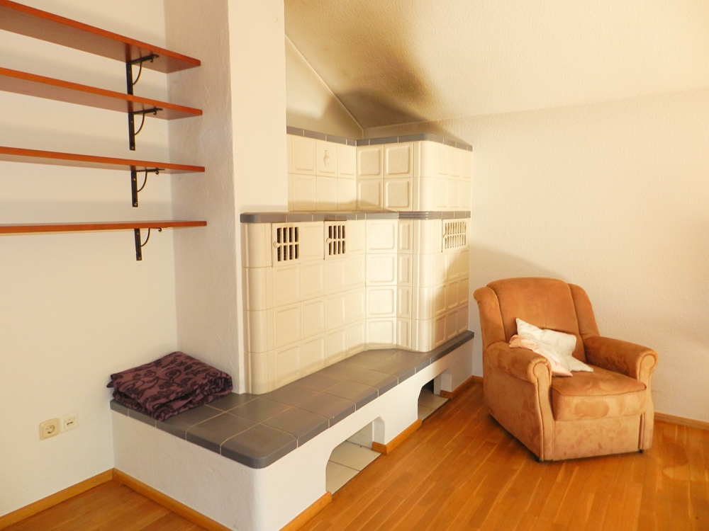 Alle Heizkörper in den Wohnräumen dieser Einheit werden über den Kachelofen gespeist. Vor der Haustüre befindet sich dazu ein mit Glas überdachter Freisitz mit ganzjährig trockenem Zugang zum Holzlagerraum. Als weitere Nutzfläche steht ein Teil des nicht ausgebauten Speichers zur Verfügung.