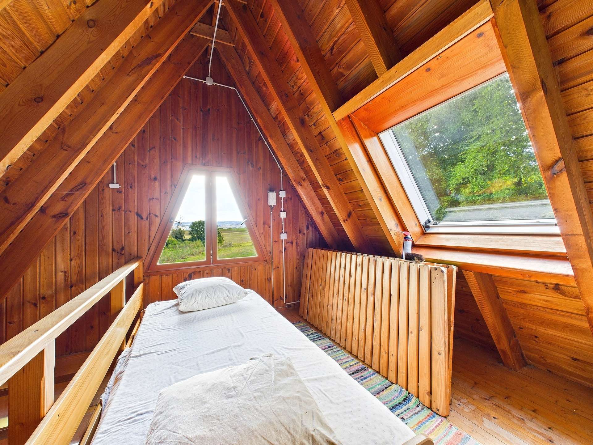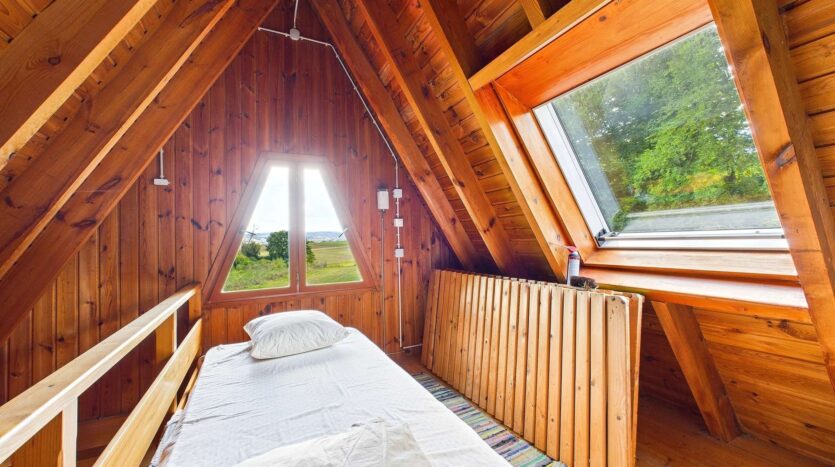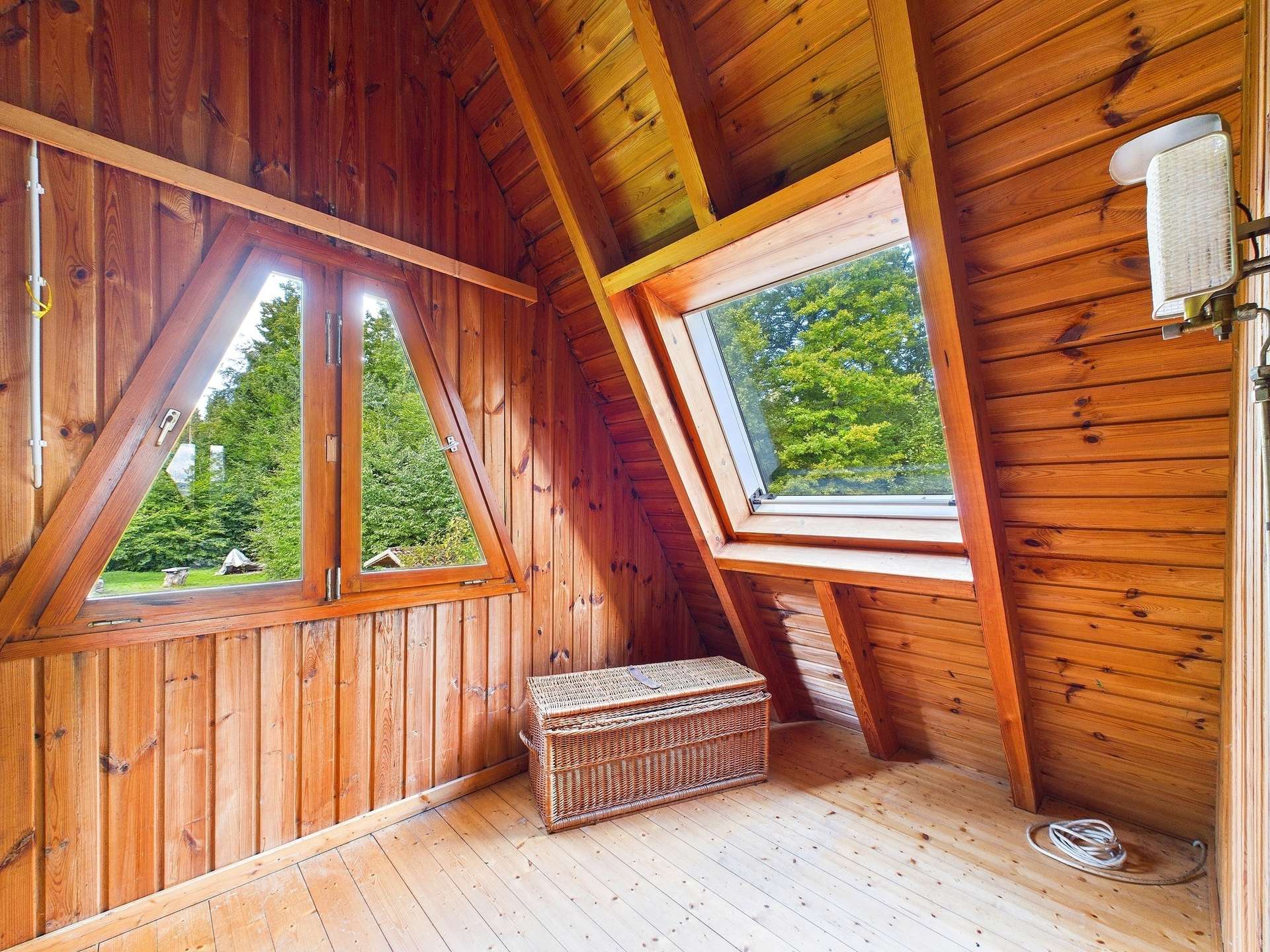 Das Obergeschoss umfasst ein Schlafzimmer sowie ein weiteres Zimmer, das sich ideal als Ankleide oder zweites Schlafzimmer nutzen lässt. Durch die Dachschrägen entsteht eine besonders behagliche Atmosphäre – morgens mit dem Blick ins Grüne erwachen, abends unter funkelndem Sternenhimmel einschlafen.