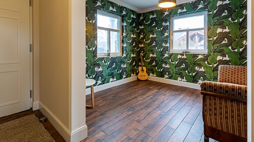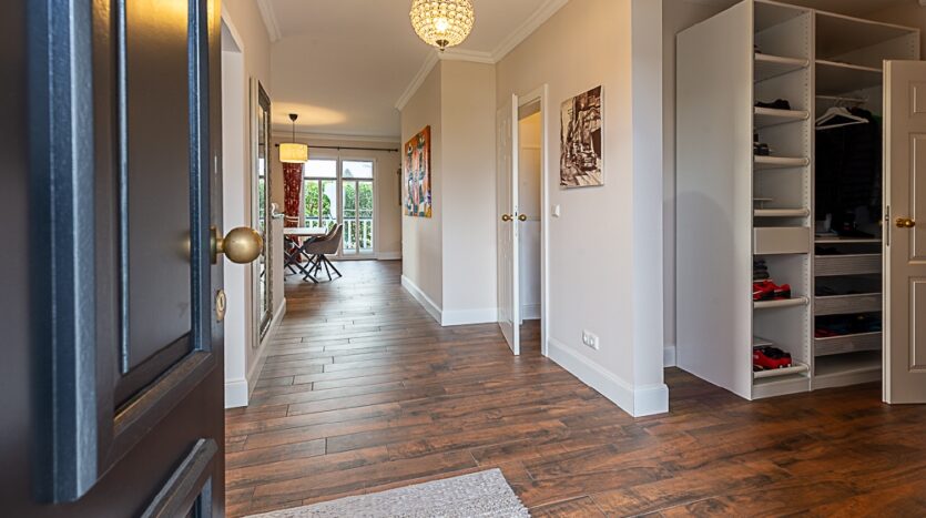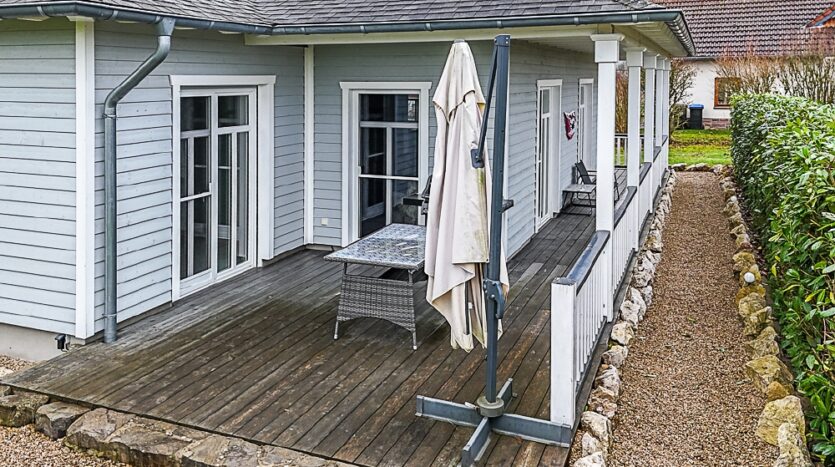offener Wohn-, Ess- und Kochbereich mit vier Ausgängen auf die Veranda und in den Garten, Schlafzimmer mit Verandazugang, anschließendes Ankleidezimmer und Badezimmer mit freistehender Badewanne/bodengleicher Dusche/Handtuchheizkörper/WC/Fenster, Gäste-WC (derzeit fehlen noch das Waschbecken und die Toilette), weiteres Schlaf- oder Arbeitszimmer, Abstellraum mit Waschmaschinenanschluss, Diele, weiteres Zimmer (derzeit mit offenem Durchgang), Vorratsraum