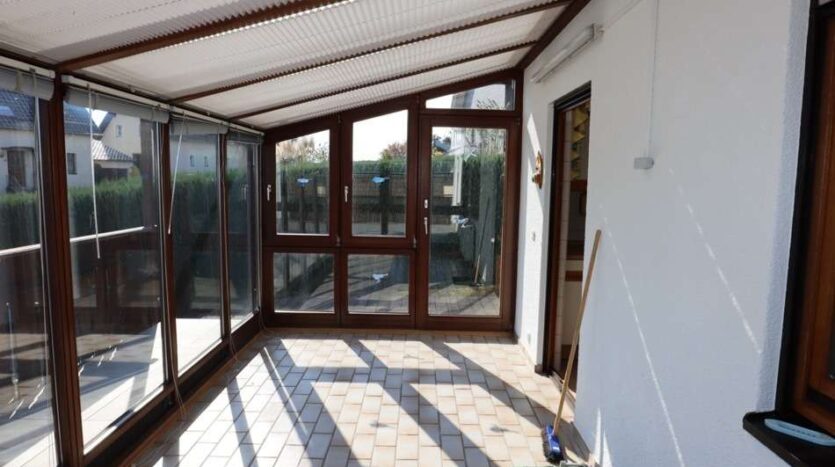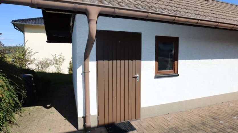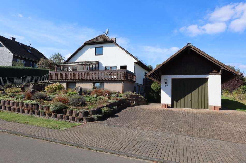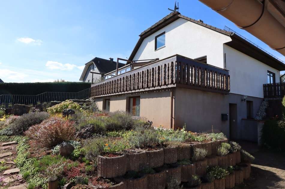 Die Gesamtwohnfläche von 159 m² verteilt sich auf 98 m² im Erdgeschoss und 61 m² im Kellergeschoss. Das Erdgeschoss verfügt über eine Diele mit Treppenhaus, Wohn- / Esszimmer, Küche, Gäste-WC, Bad und Schlafzimmer. Das Schlafzimmer hat einen kleinen separaten Balkon mit Blick ins Grüne und es gibt eine schöne Terrasse mit geräumigem Wintergarten für gemütliche Stunden. Im Kellergeschoss befinden sich eine Diele mit separatem Nebeneingang, Bad, ein praktischer Hauswirtschaftsraum mit Sauna, zwei Schlafzimmer und ein Wohnzimmer. Zudem befindet sich hier ein Abstellraum, der Heizungsraum, HAR und ein Weinkeller. Das Dachgeschoss erreicht man über eine Zugleiter. Hier gibt es zusätzlichen Stauraum. Die neben dem Haus befindliche separate große Einzelgarage bietet genügend Platz für eine kleine Werkstatt. Der gepflasterte Bereich vor der Garage bietet zudem weitere Stellplätze für Pkw.