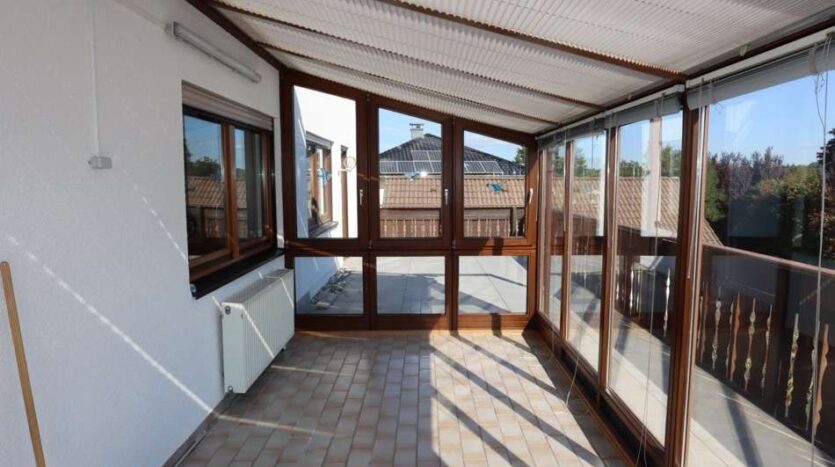 Erdgeschoss: Eingang, Diele mit Garderobe und Treppenhaus, GWC, Bad mit Dusche, Badewanne und WC, Schlafzimmer mit eigenem Balkon, Küche mit Zugang zum Wintergarten, Wohn-/ Esszimmer mit Zugang zur Terrasse.