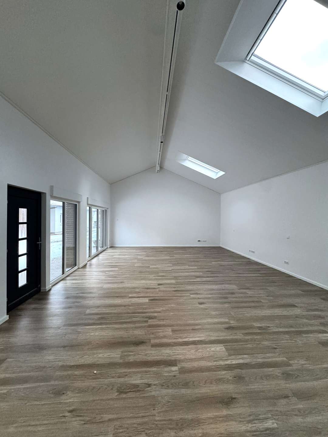 Dieser moderne Bungalow bietet auf ca. 95 m² Wohnfläche ein stimmiges Wohnkonzept mit klaren Linien und einer angenehmen Großzügigkeit. Die Wohneinheit liegt in einem gepflegten Ensemble mit nur sechs Einheiten und verfügt über einen eigenen Eingang. Beim Betreten öffnet sich der helle Wohn- und Essbereich mit offener Küche, der durch seine bis in den Giebel offene Decke ein beeindruckendes Raumgefühl vermittelt. Eine großzügige Fensterfront sowie zwei Dachfenster lassen viel Tageslicht herein und schaffen eine lichtdurchflutete Atmosphäre.