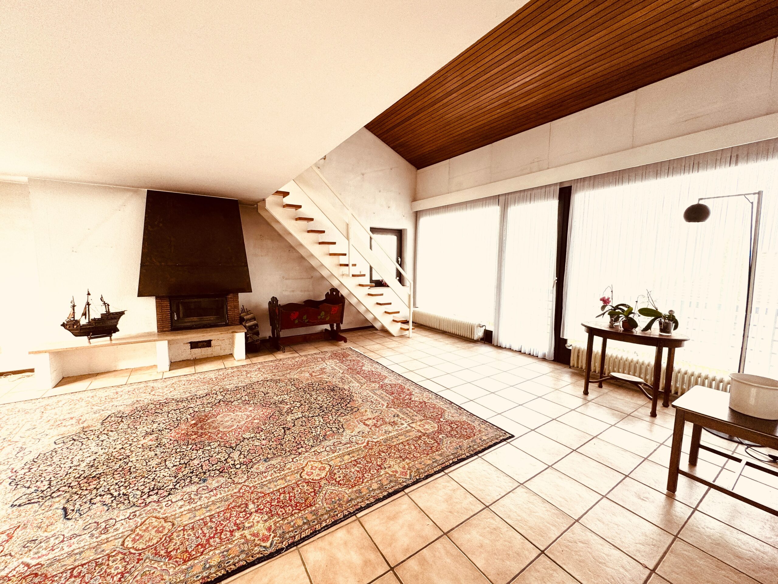 zum Garten. Ein Kamin im offenen Wohnbereich,