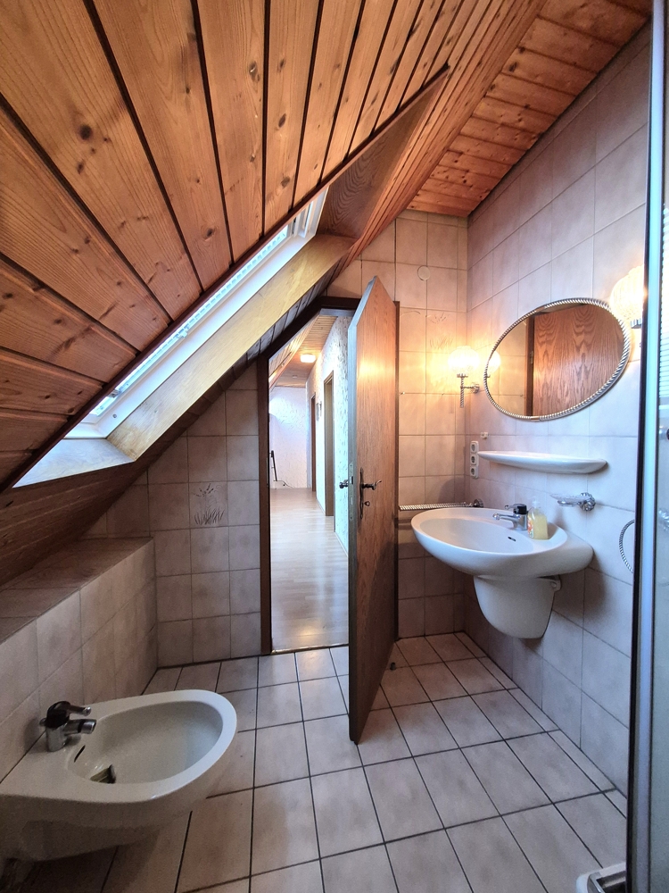 Bisher ist im Dachgeschoss ein Dusch-Bad in der Dachschräge untergebracht, weitere Anschlüsse wären auch im Erdgeschoss verfügbar. Alternativ könnte der Raum auch als Waschküche oder Vorratsraum genutzt werden.