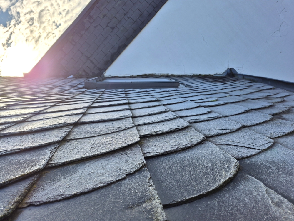 Der überwiegende Teil des Objektes wurde massiv mit Betonsteinen und Betondecken errichtet. Der Dachstuhl und die Eindeckung mit Naturschiefer stammen offensichtlich noch vom vorherigen Bauwerk und sind in gutem Zustand. Die Gaube zur Straße hin ist mit Bitumen belegt.