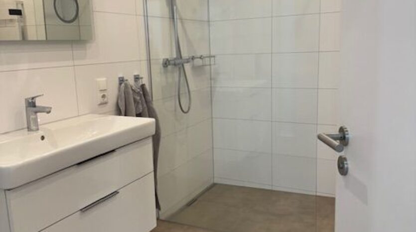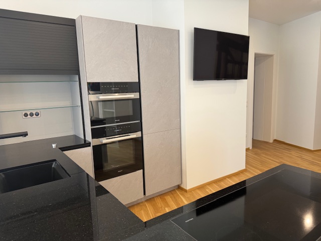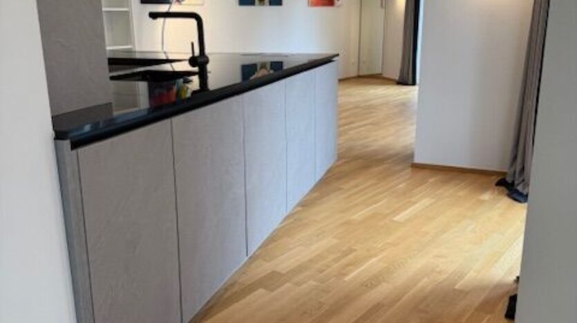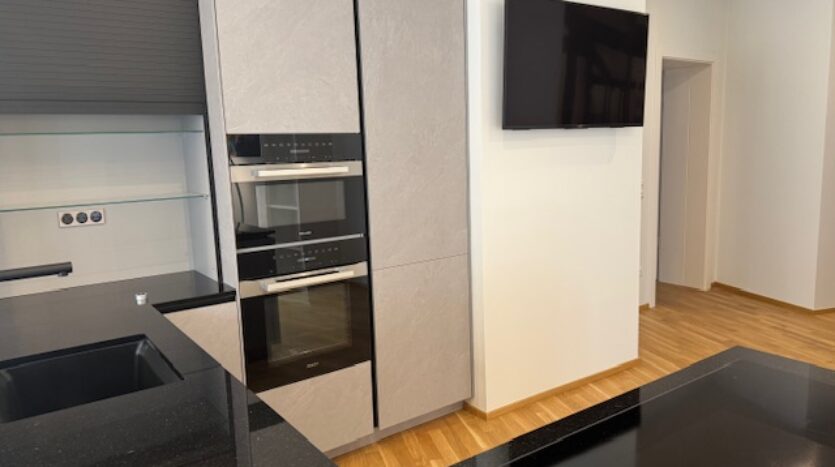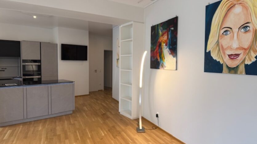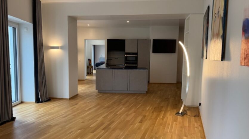 Der großzügige, lichtdurchflutete Wohnbereich mit offener Küche (wenig genutzt) schafft ein einladendes Raumgefühl und überzeugt durch klare Linien, hochwertige Materialien und ein harmonisches Farbkonzept.