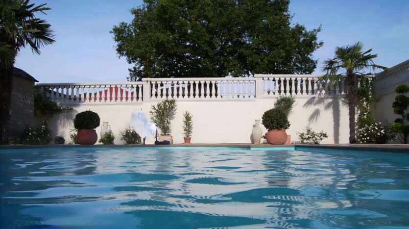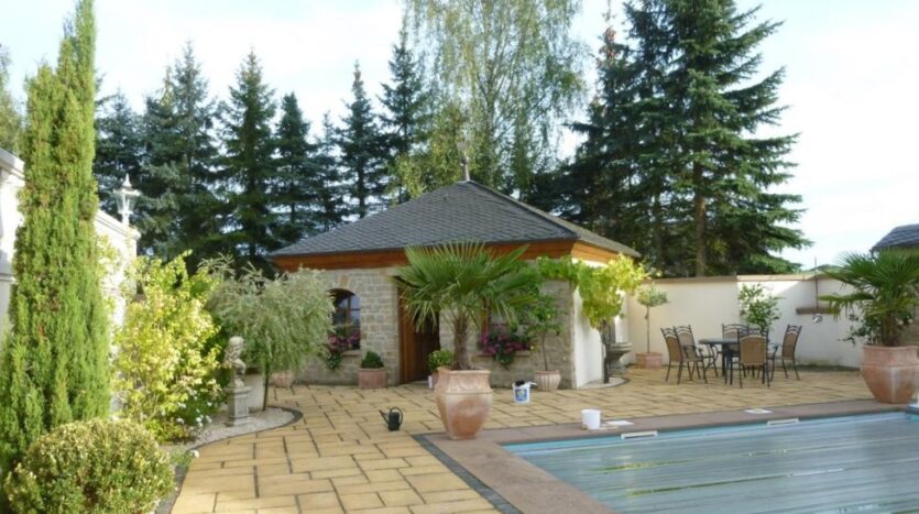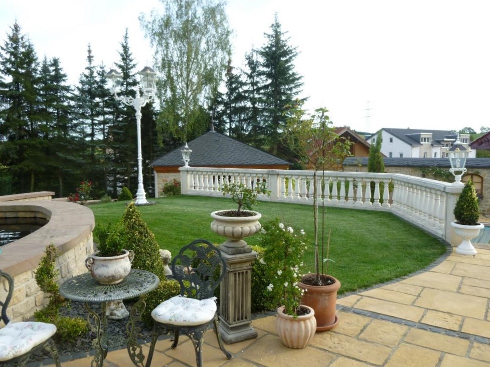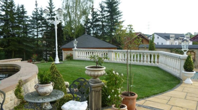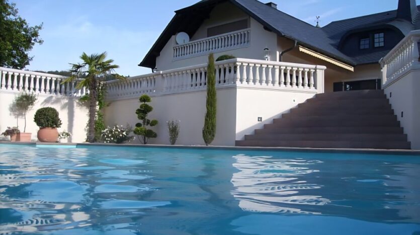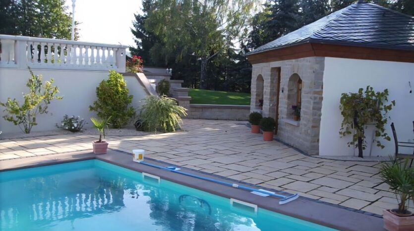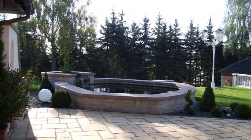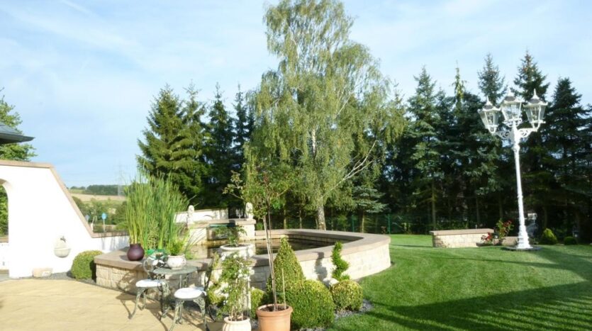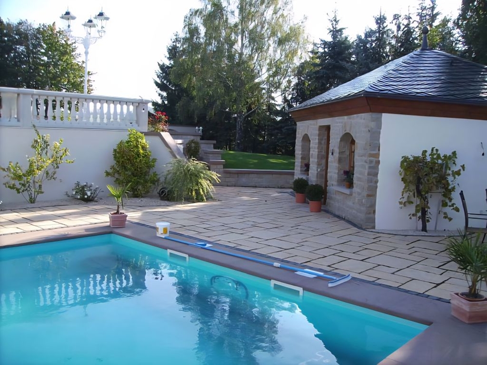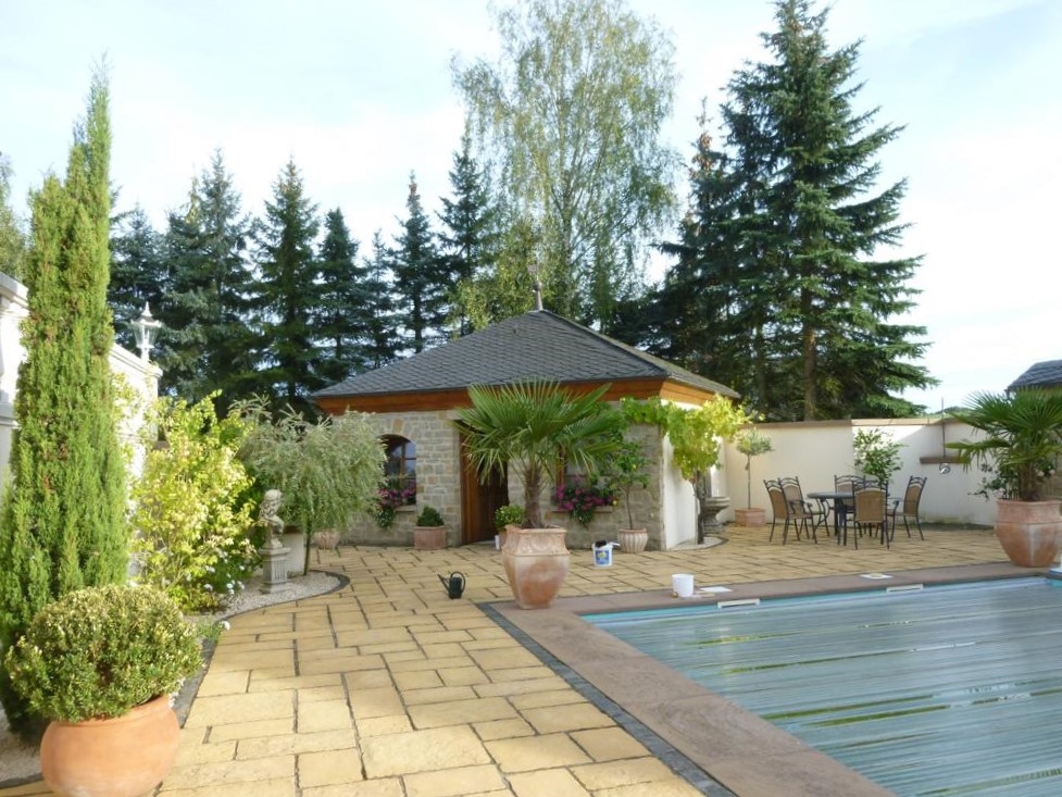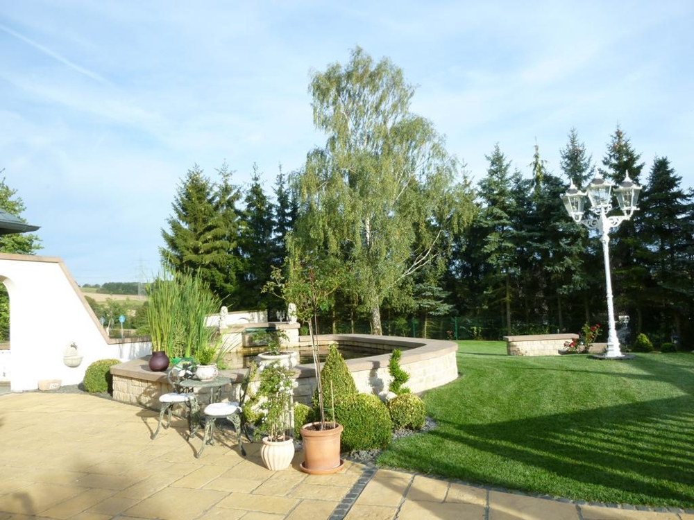Im Innenhof befindet sich eine herrlich angelegte Außenterrasse mit Zierteich und nahtlosem Übergang auf die vorhandene Grünfläche. Von hier aus genießen Sie einen unbeschreiblich schönen Blick auf den ca. 9,20 x 4,50 Meter großen und beheizten Außenpool und auf das hübsche, massiv gebaute Saunahaus mit Dusche.