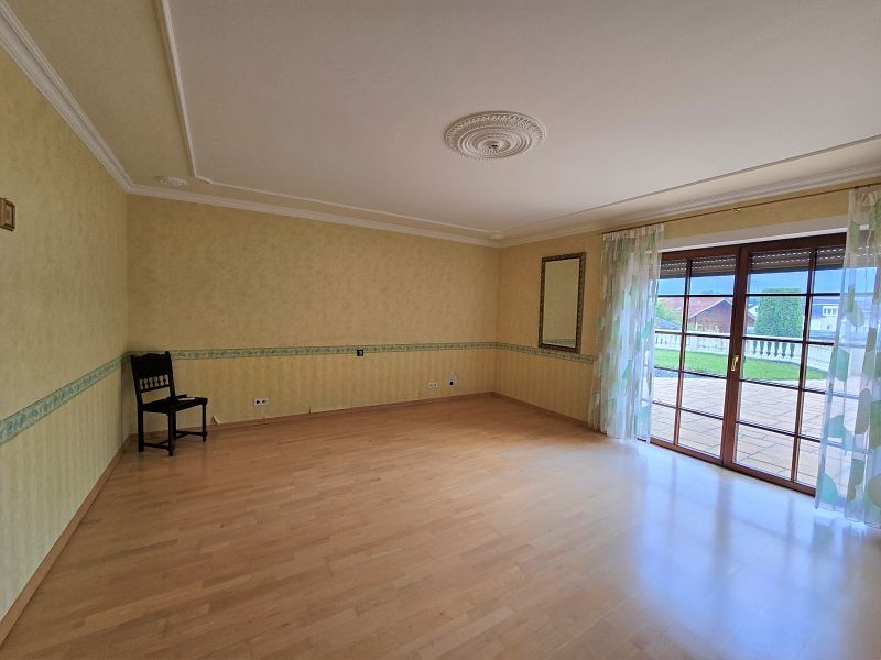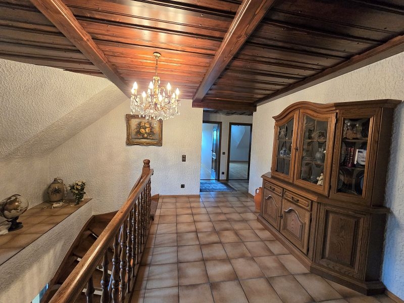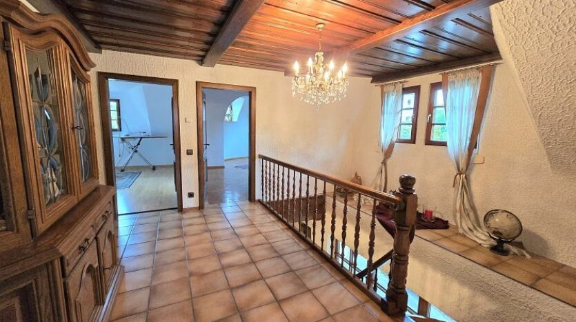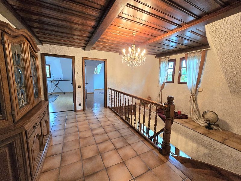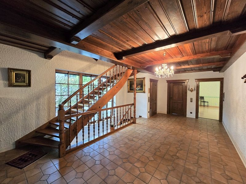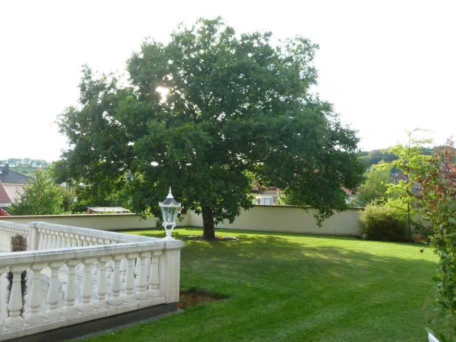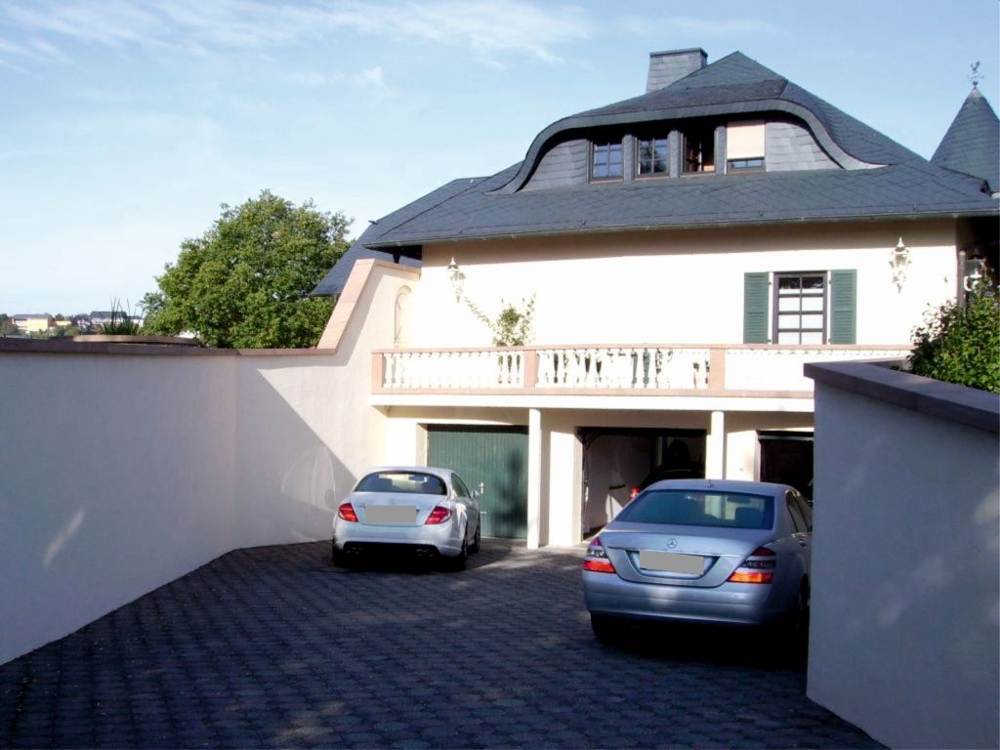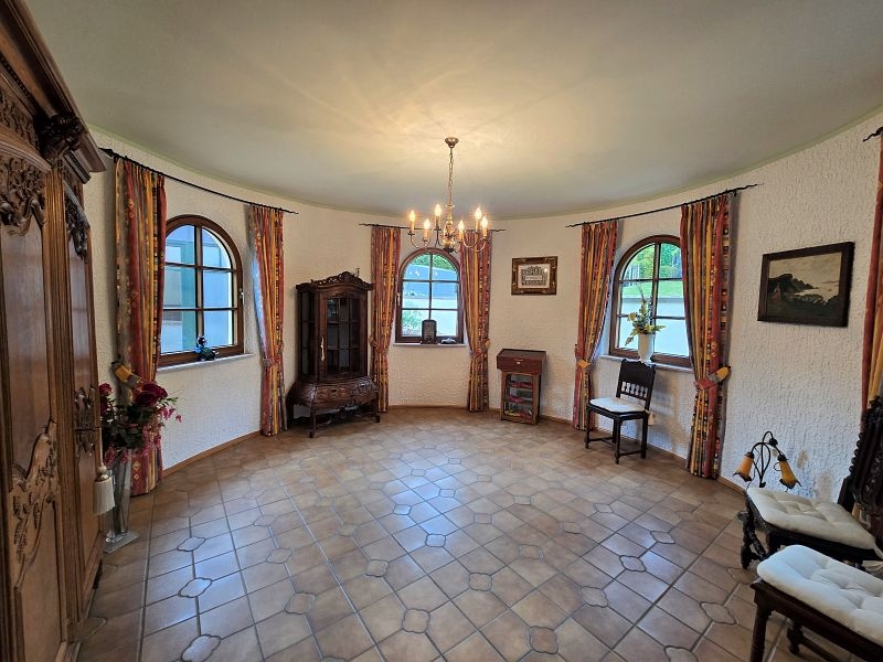 Im Erdgeschoss befinden sich der vorgesetzte Eingangsbereich mit Garderobe, ein sehr geräumiges Elternschlafzimmer, ein Elternbad mit Eckbadewanne und Dusche, eine großzügige Diele, das Turmzimmer (ca. 20 m²), die Küche mit neuwertiger Einbauküche und der ca. 68 m² große Wohn- und Essbereich mit Kamin und mit Zugang zur Außenterrasse. Ein weiterer Raum mit integrierter Küche wurde als Grill- und Outdoorküche genutzt.Villa mit Außenpool, Sauna, Wärmepumpe in hervorragender Lage Nähe Luxemburg!