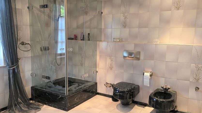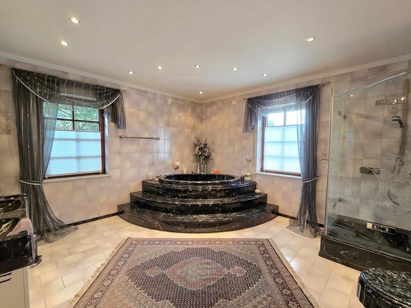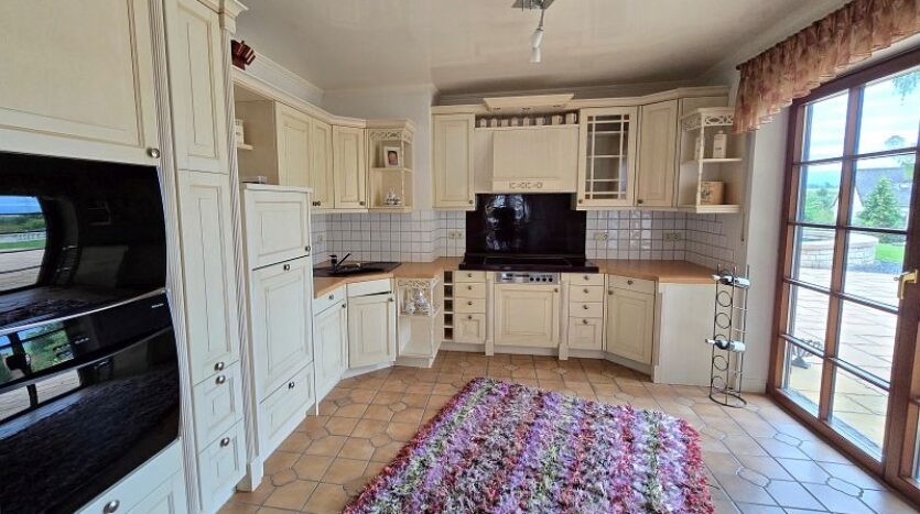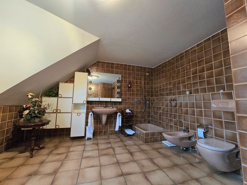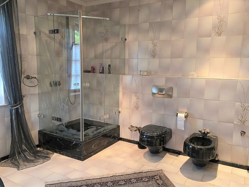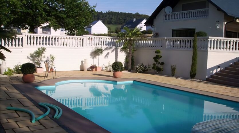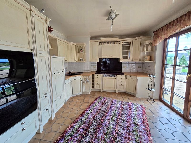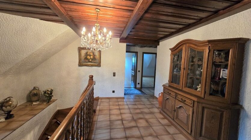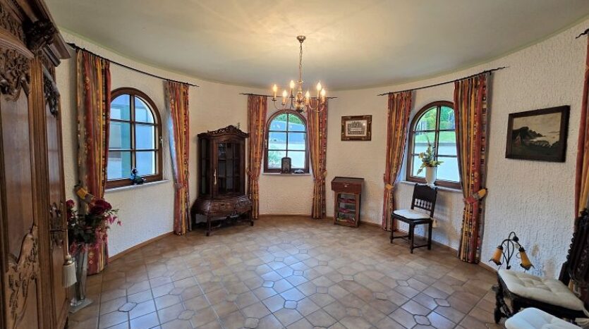 Im Erdgeschoss befinden sich der vorgesetzte Eingangsbereich mit Garderobe, ein sehr geräumiges Elternschlafzimmer, ein Elternbad mit Eckbadewanne und Dusche, eine großzügige Diele, das Turmzimmer (ca. 20 m²), die Küche mit neuwertiger Einbauküche und der ca. 68 m² große Wohn- und Essbereich mit Kamin und mit Zugang zur Außenterrasse. Ein weiterer Raum mit integrierter Küche wurde als Grill- und Outdoorküche genutzt.Villa mit Außenpool, Sauna, Wärmepumpe in hervorragender Lage Nähe Luxemburg!