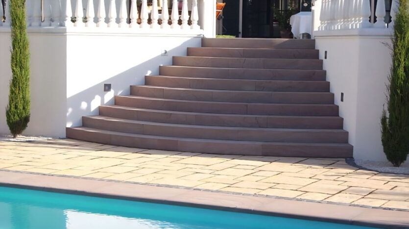 Eine leicht geschwungene Treppe aus maßgefertigten Sandsteinstufen verbindet die Außenterrasse mit dem Schwimmbad und dem Saunabereich.
