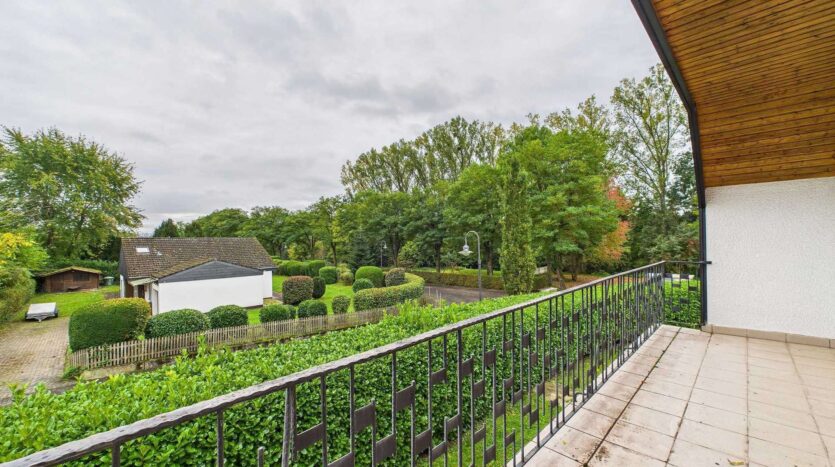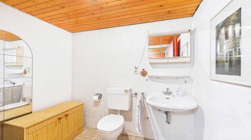 Die Einliegerwohnung verfügt über einen eigenen Eingang, einen separaten Gartenanteil und eine bereits erneuerte Terrasse sowie eine Garage mit Stellplatz vor dieser. Die Wohnung ist sowohl für die Vermietung als auch als Büro, Praxis oder Wohnraum für Familienangehörige – beispielsweise für die Großeltern – bestens geeignet. Im Erdgeschoss befinden sich das Wohnzimmer, die Küche und ein Gäste-WC. Im Dachgeschoss liegen das Schlafzimmer mit Balkon sowie das Badezimmer mit Wanne und Dusche. Der Balkon der Einliegerwohnung sollte erneuert werden, da sich an dieser Stelle Feuchtigkeit zeigt, die in die Hauswand übergeht – eine Gelegenheit, diesen Bereich modern und langlebig nach eigenen Vorstellungen neu zu gestalten.