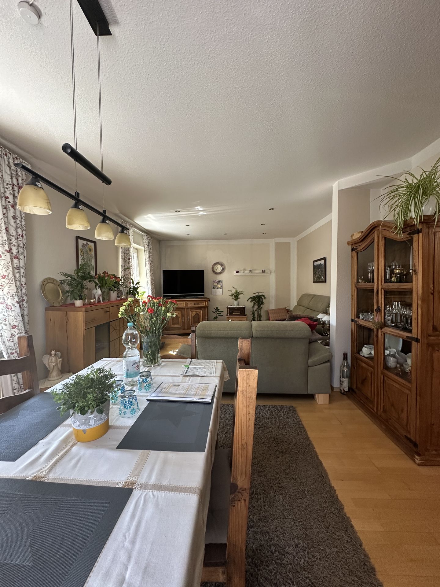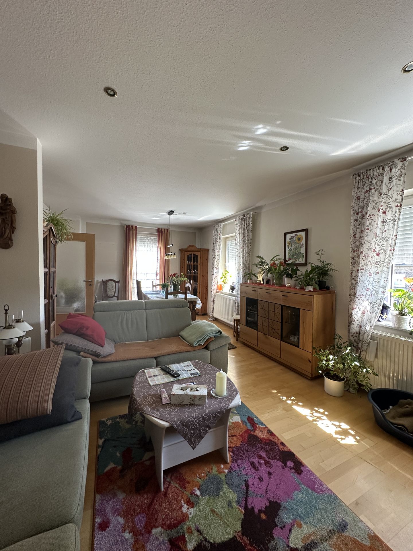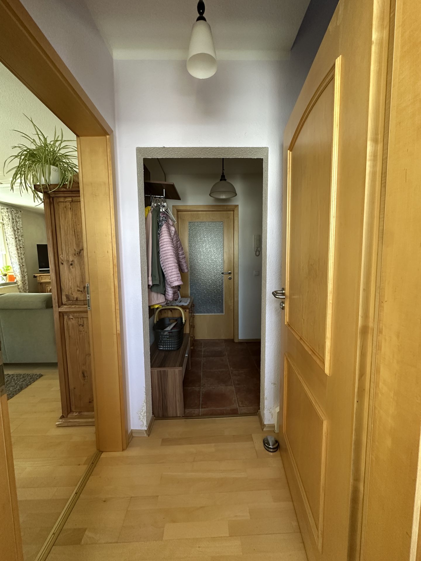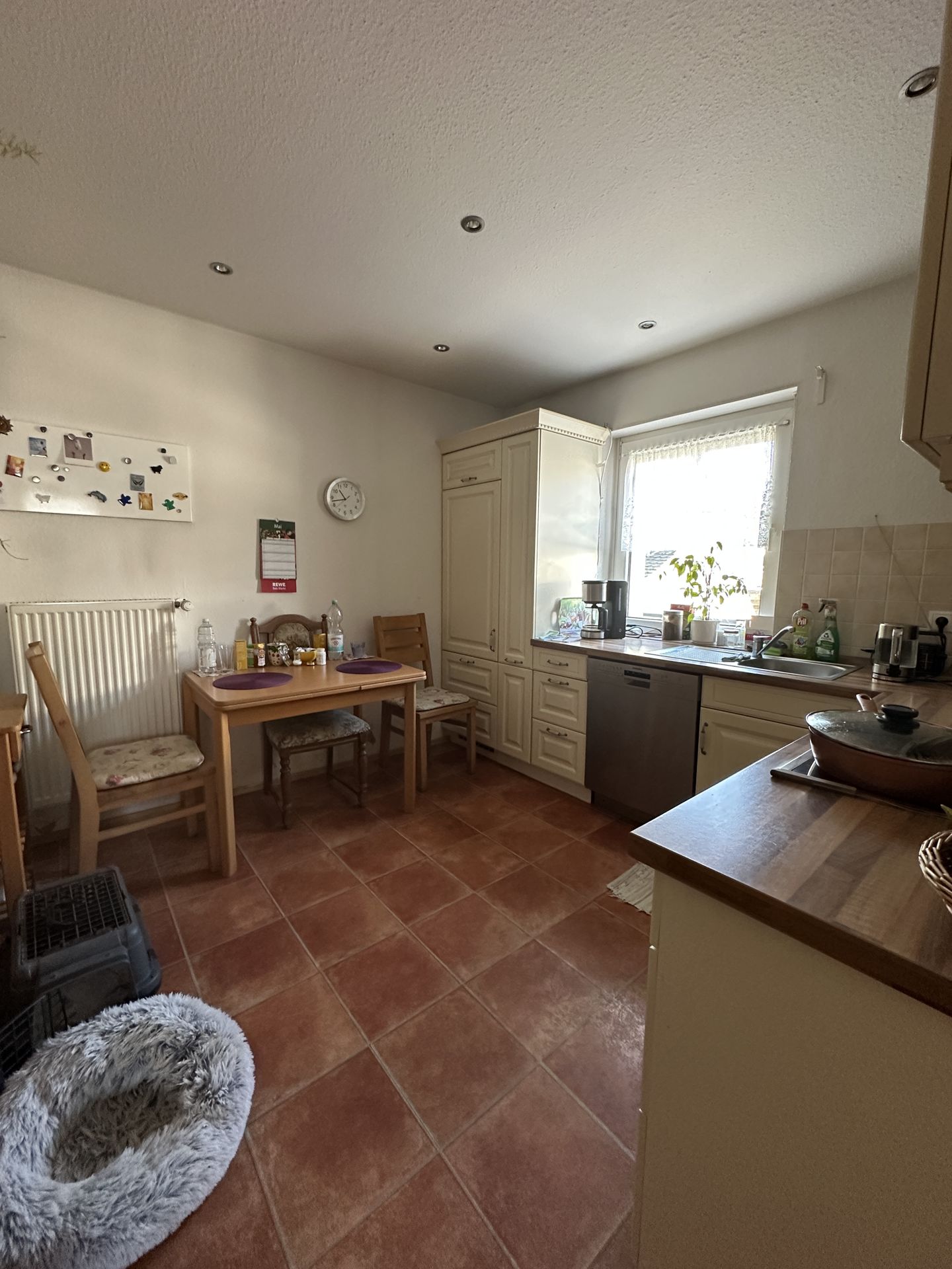 ansonsten: Fliesen, Echtholzparkett, PVC in der Küche